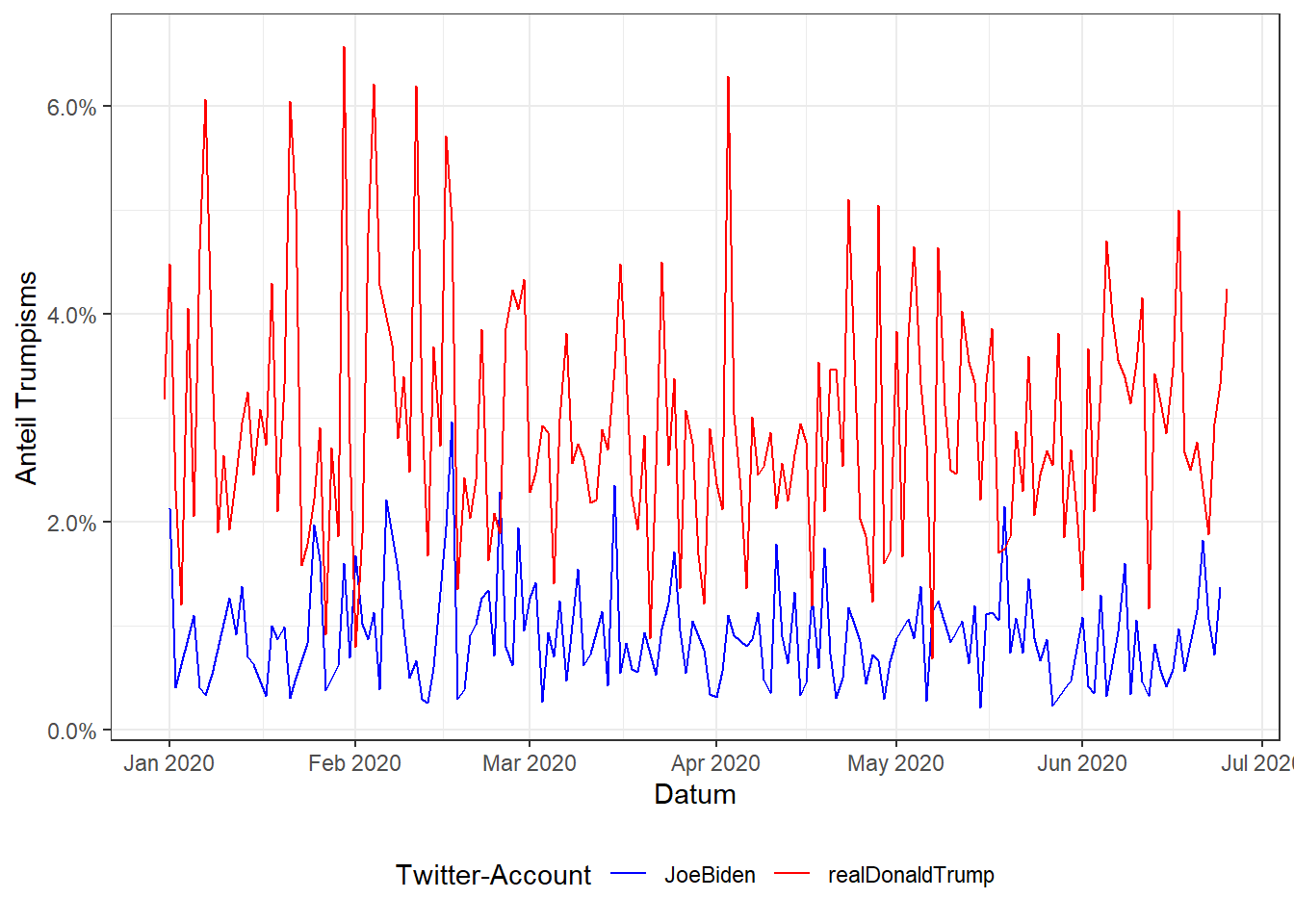 Das Ergebnis lässt sich einfach interpretieren: rund 2,8 Prozent aller Wörter in Trumps Tweets sind eines der 90 Trumpisms in unserem Wörterbuch, bei Joe Biden sind dies nur rund 0,8 Prozent – auch proportional verwendet Trump also deutlich mehr Trumpisms als Biden.
