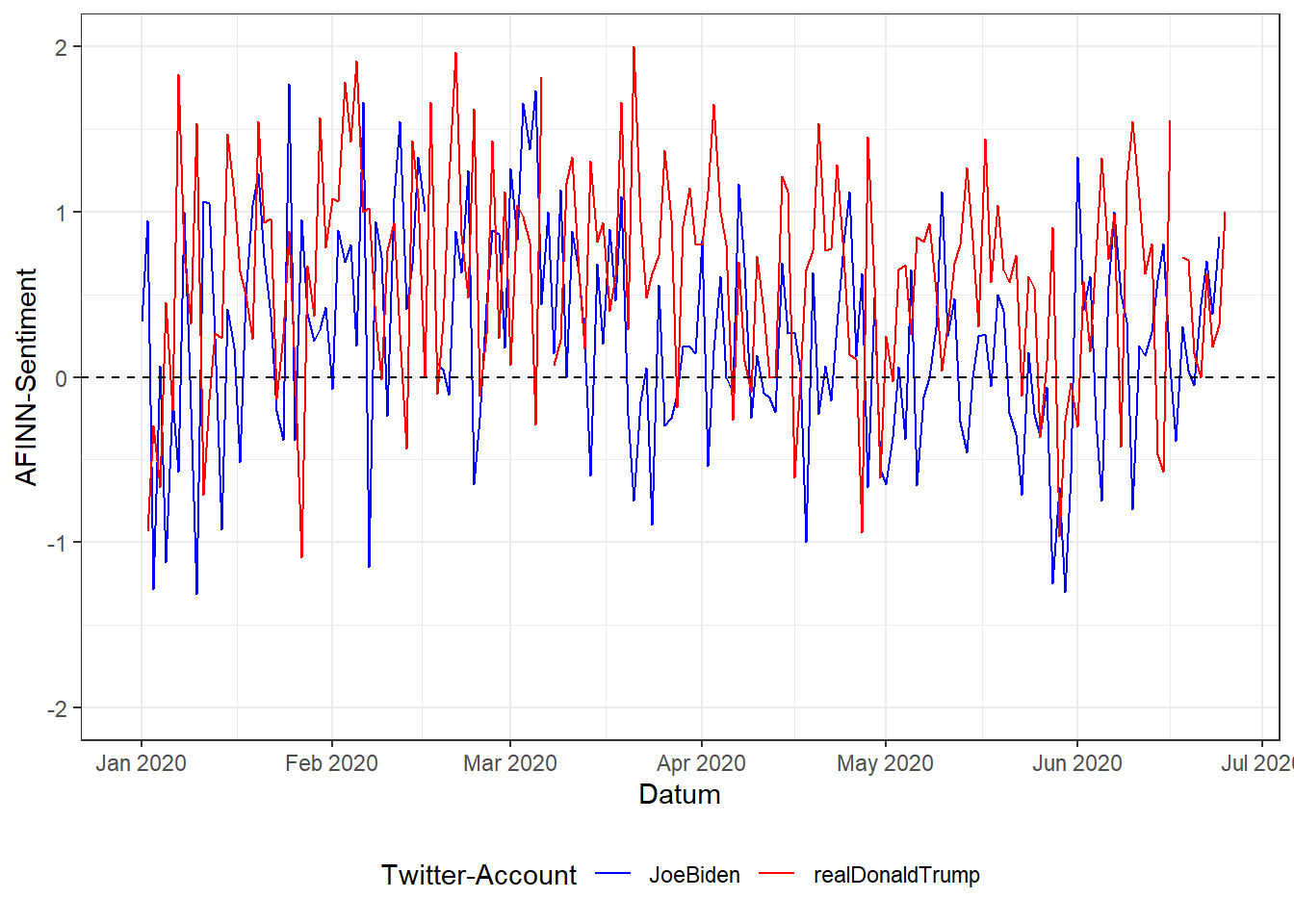 Das berechnete Sentiment der Tweets mittels AFINN-Dictionary ist also durchaus mit der vorherigen Sentiment-Analyse, basierend auf Bing Lius Sentiment Lexicon, vergleichbar: auch hier überwiegt bei beiden Kandidaten positives Sentiment, die Ausschläge nach unten kommen zu denselben Zeitpunkten, wenn auch die absoluten Wertausprägungen natürlich unterschiedlich (und auch unterschiedlich skaliert) sind.