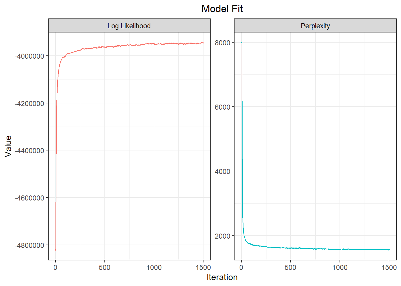 options = list(seed = 667))Zunächst sollten wir den Modelfit überprüfen. keyATM bietet hierfür die Funktion plot_modelfit(), die zwei Kennwerte – Log-Likelihood und Perplexity – im Verlauf der Modelliterationen darstellt. Bei einem Modell, das gut zu den Daten passt, sollte sich im Verlauf der Iterationen die Log-Likelihood auf einem höheren, die Perplexity auf einem geringeren Wert einpendeln. Beides ist hier der Fall (erneut gilt jedoch: ob das Modell auch inhaltlich sinnvoll ist, muss manuell und inhaltlich interpretiert werden):