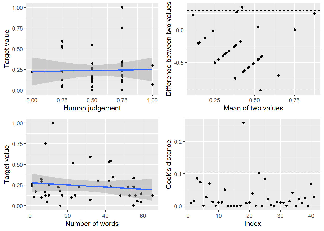- rechts oben ist ein sogenannter Bland-Altmann-Plot, der den Mittelwert zweier Messungen (hier also manueller und automatischer Codierung eines Tweets) gegen deren Differenz abträgt. Hier sollten im Idealfall keinen Muster erkennbar sein (damit keine systematischen Unterschiede zwischen manueller und automatischer Codierung vorliegen) und keine allzu großen Schwankungen vorliegen (damit manuelle und automatische Codierung im Mittel nicht zu stark voneinander abweichen).