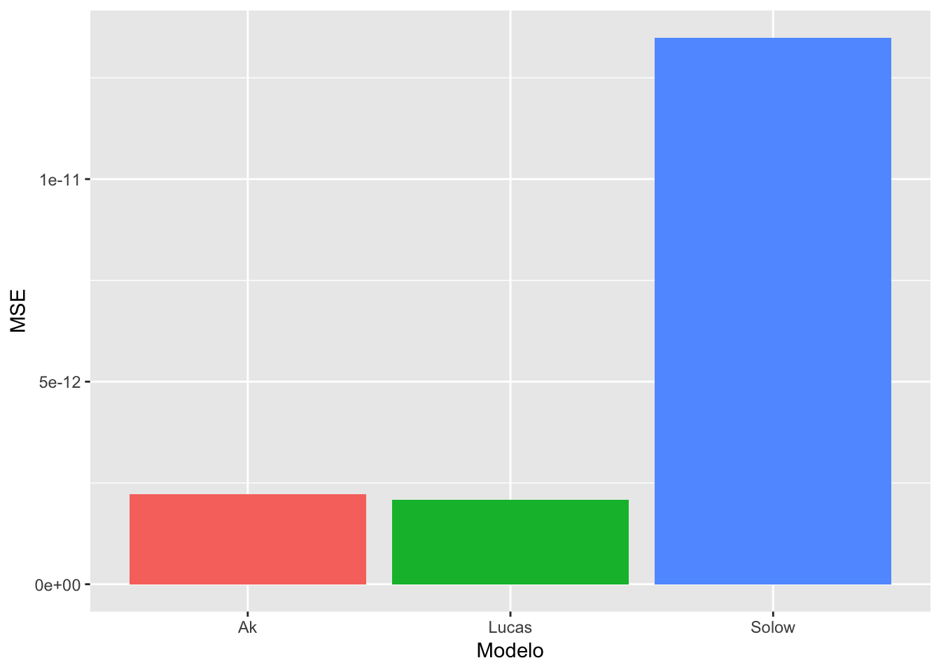 Observemos que entre los modelos testeados, el modelo con menor error cuadrátcio medio es el modelo de Lucas. Aún asi, como obtuvimos resultados negativos para el parámetro asociado al capital y como notamos que el capital humano no creció como lo describe el modelo de Lucas, no tomaremos este modelo como el ganador. En nuestro caso, entre estos tres modelos elegimos como el mejor al Modelo Ak.