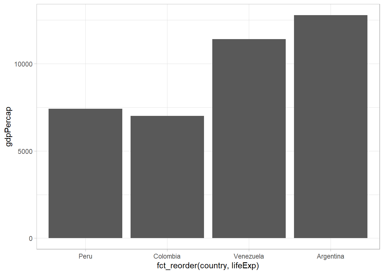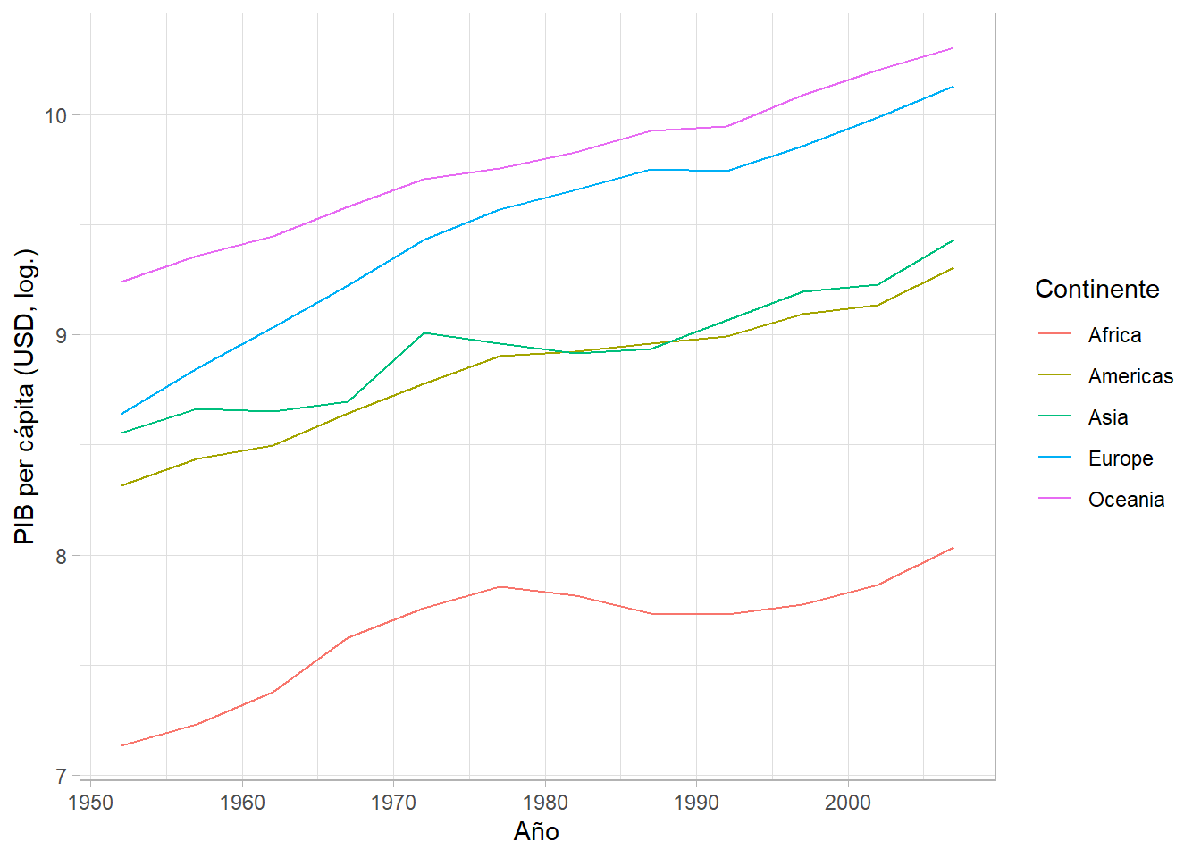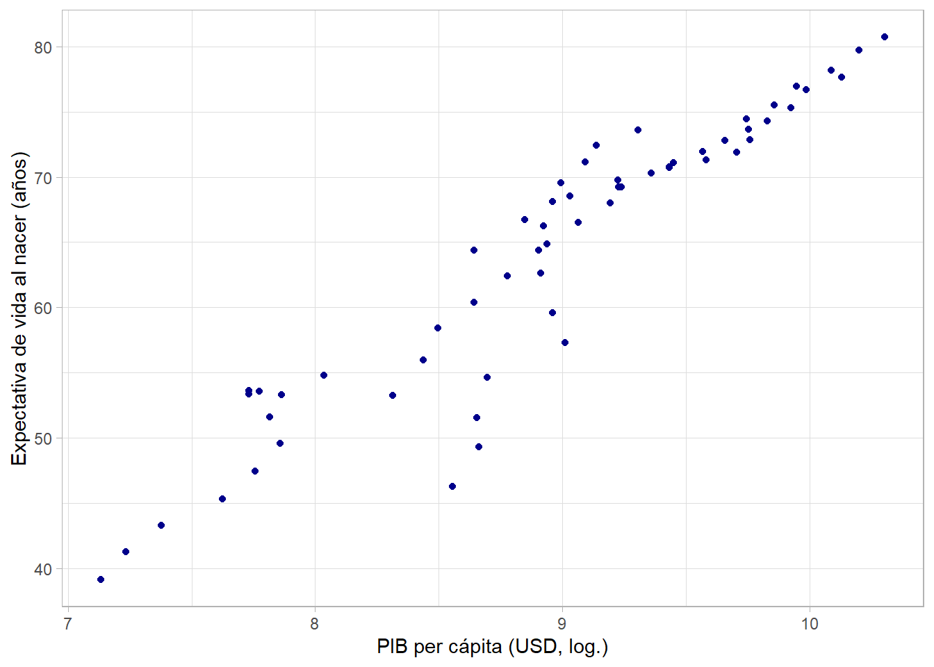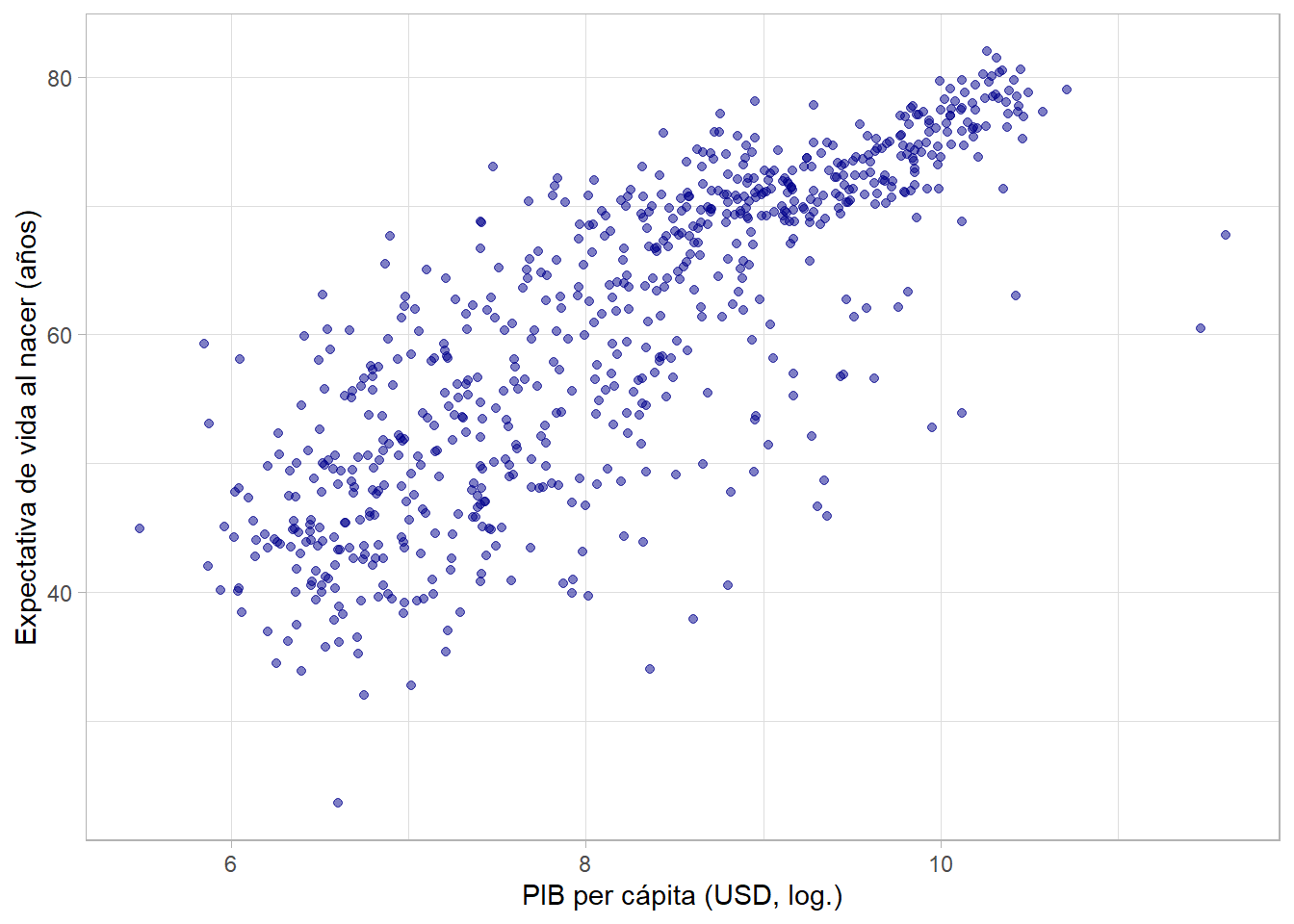 Parece que hay una relación positiva, pero no estrictamente lineal. Más bien, puede ser de tipo logarítmico, indicando rendimientos decrecientes. Nuevamente, podemos hacer la transformación de la variable gdpPercap directamente en la función ggplot() usando log():