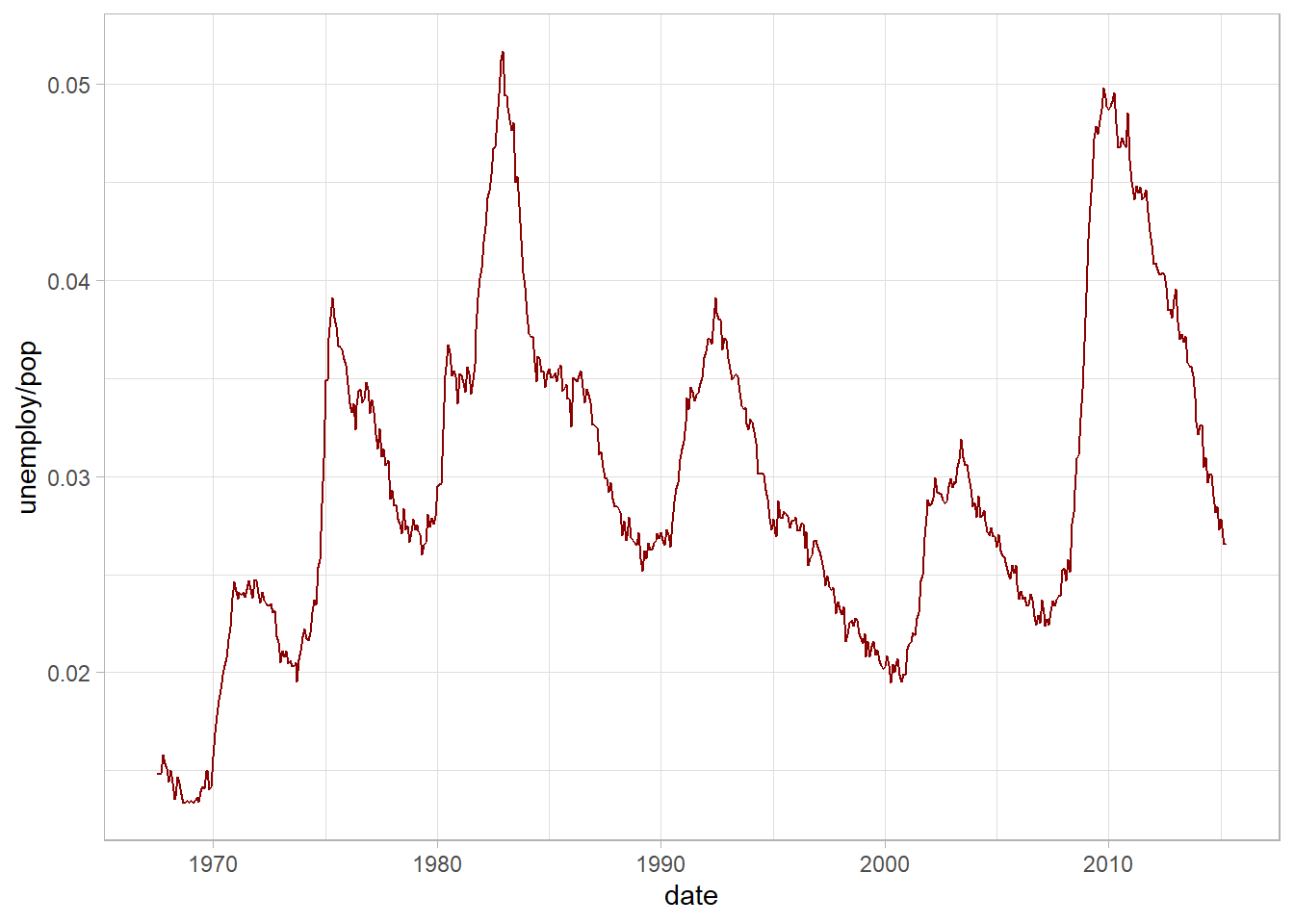 Calculamos la tasa de desempleo dentro de la misma función (unemploy/pop) y graficamos el resultado a través del tiempo. Podemos observar claramente un pico durante la “Gran Recesión” de 2007-2009: