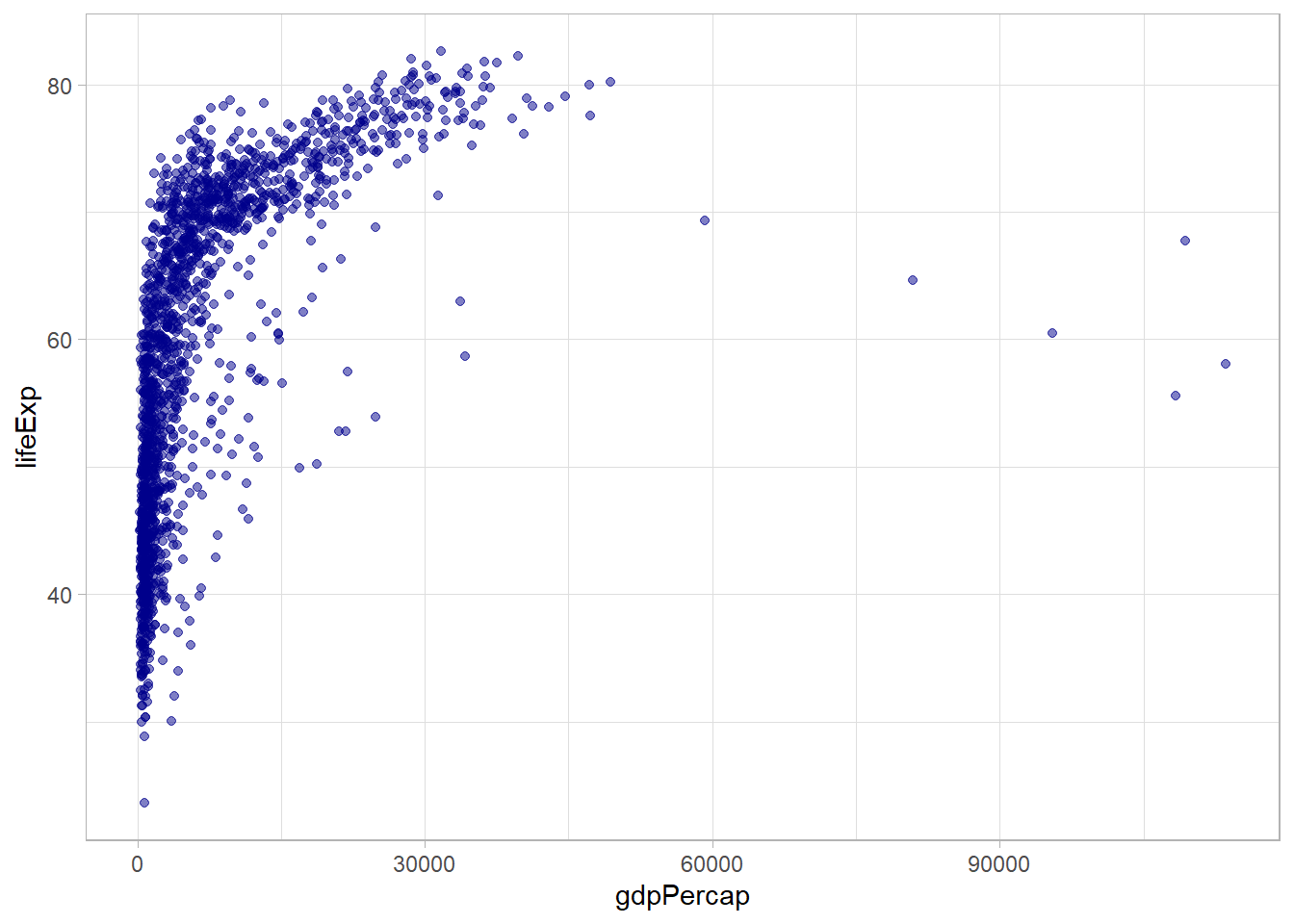 Vemos que hay información sobre expectativa de vida al nacer (lifeExp) y el PIB per cápita (gdpPercap) para 142 países en intervalos de 5 años. ¿Cuál es la relación entre estas dos variables? Podemos hacer una gráfica de dispersión: