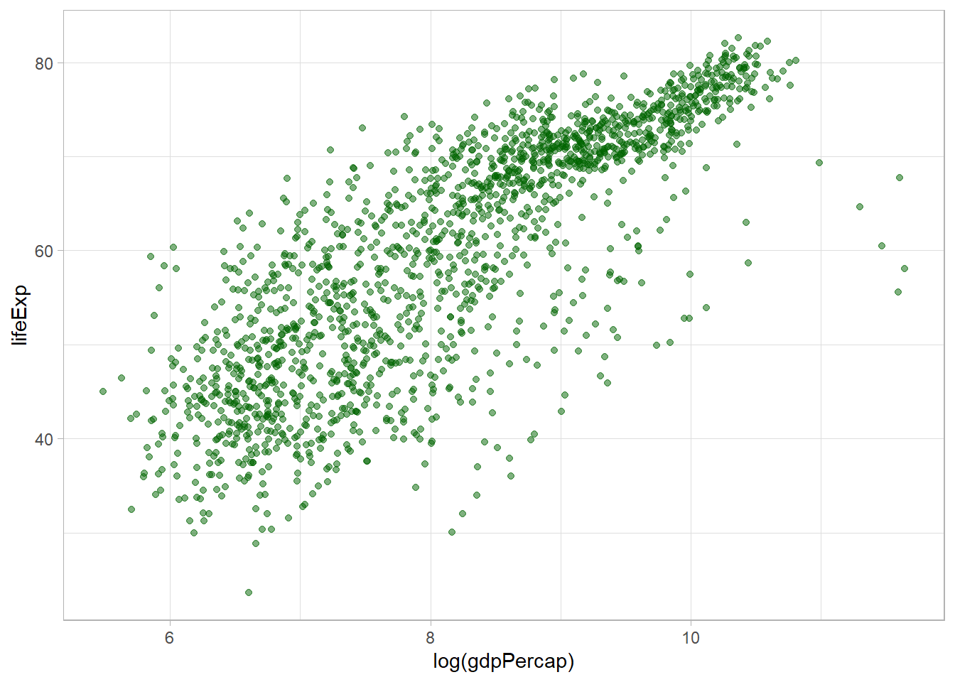 ggplot(data = gapminder, aes(x = log(gdpPercap), y = lifeExp)) +