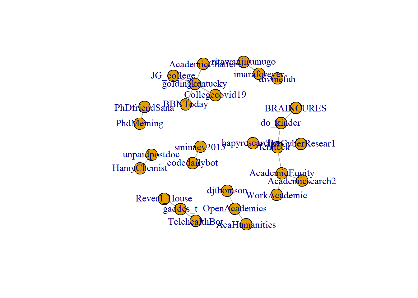 ## [5] "BRAINCURES" "codedailybot" "Collegecovid19" "divinefuh"