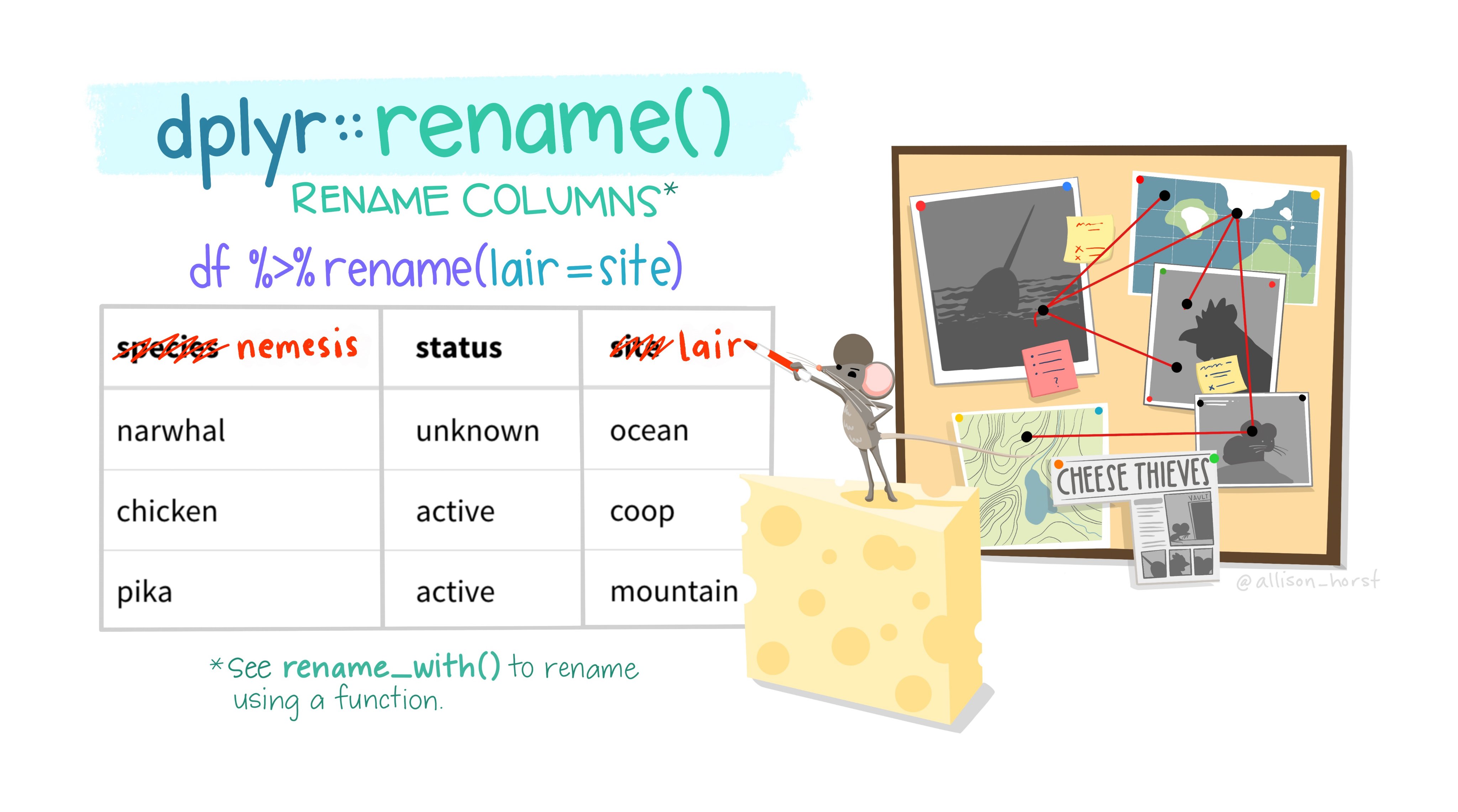 Want to rename a variable? You can use the function rename() to change a column. The way rename() work is by taking two arguments, the dataset you hope to use and the name change with the following format, new_name = old_name. You can even include more than one variable! Let’s see that in action below: