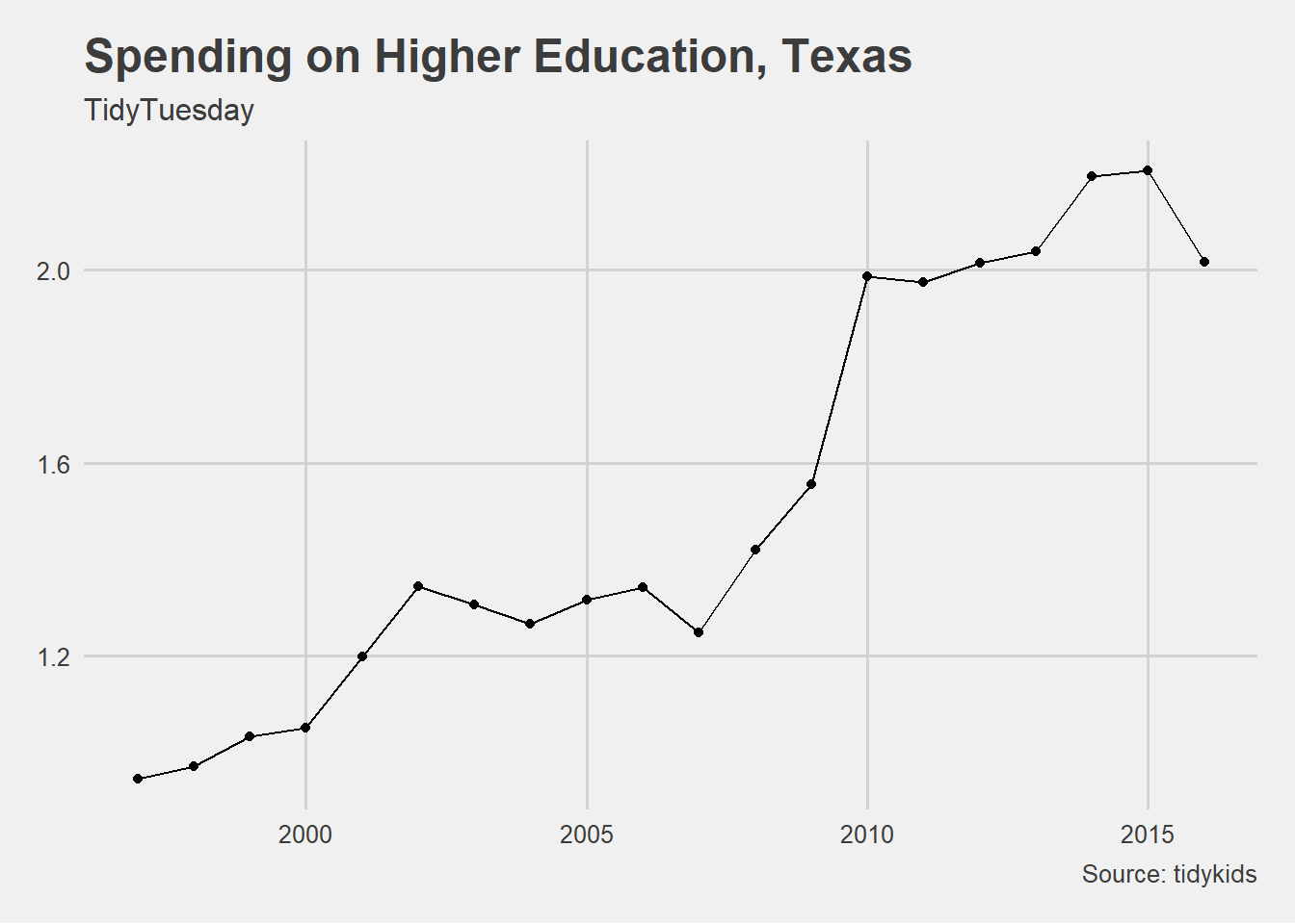 For example, to increase the margins around a plot, you would use the plot.margin argument in theme(). We’ll practice using a plot we made earlier (a line graph of yearly spending on Texas higher education).