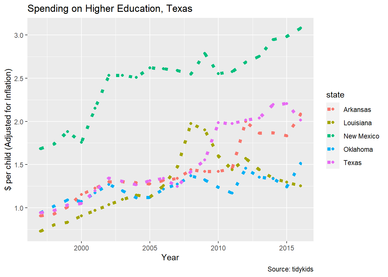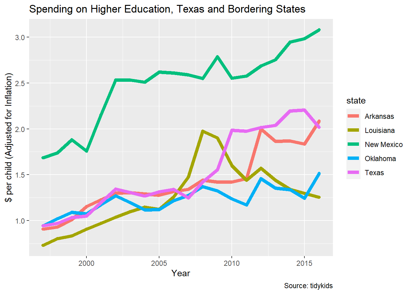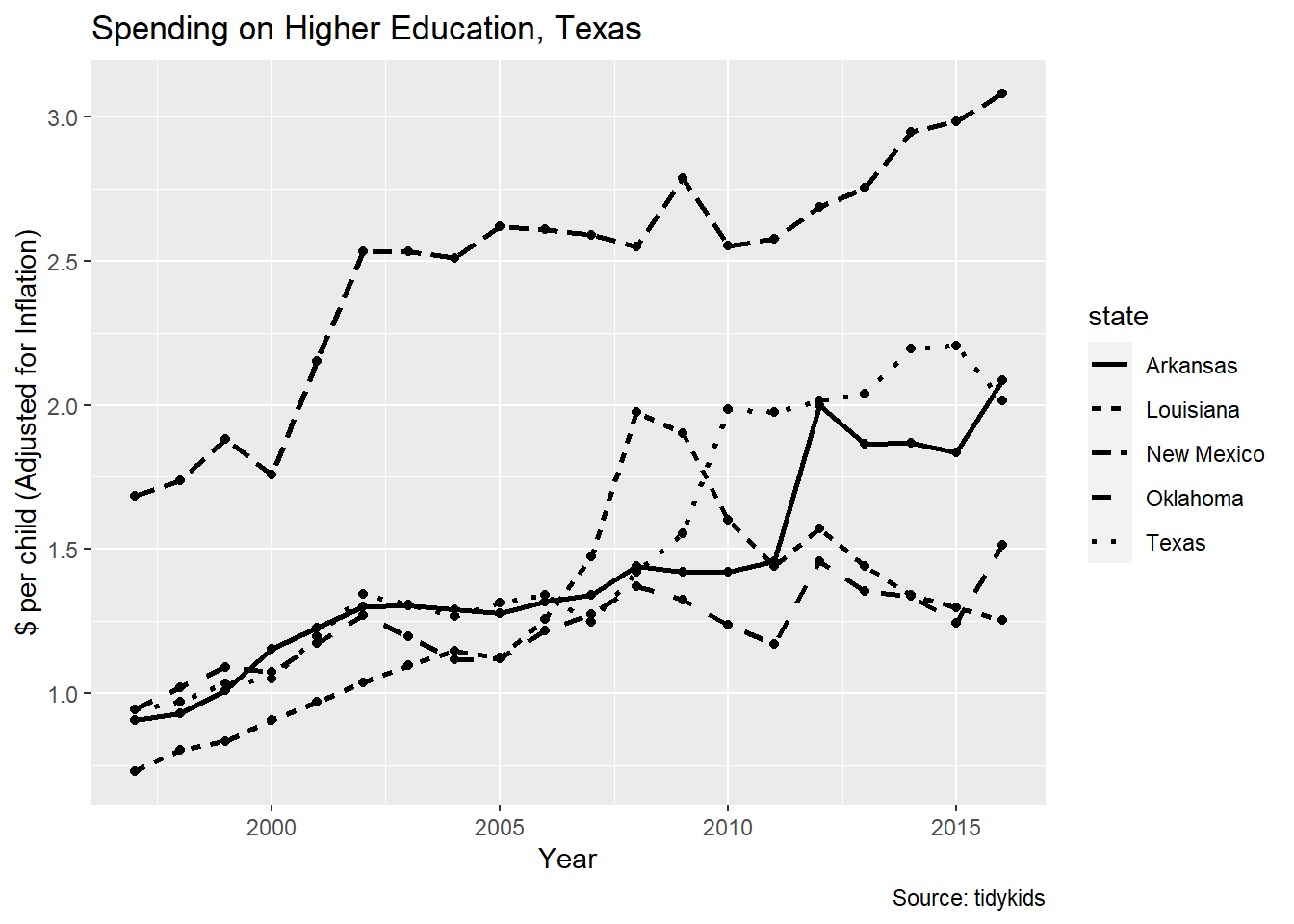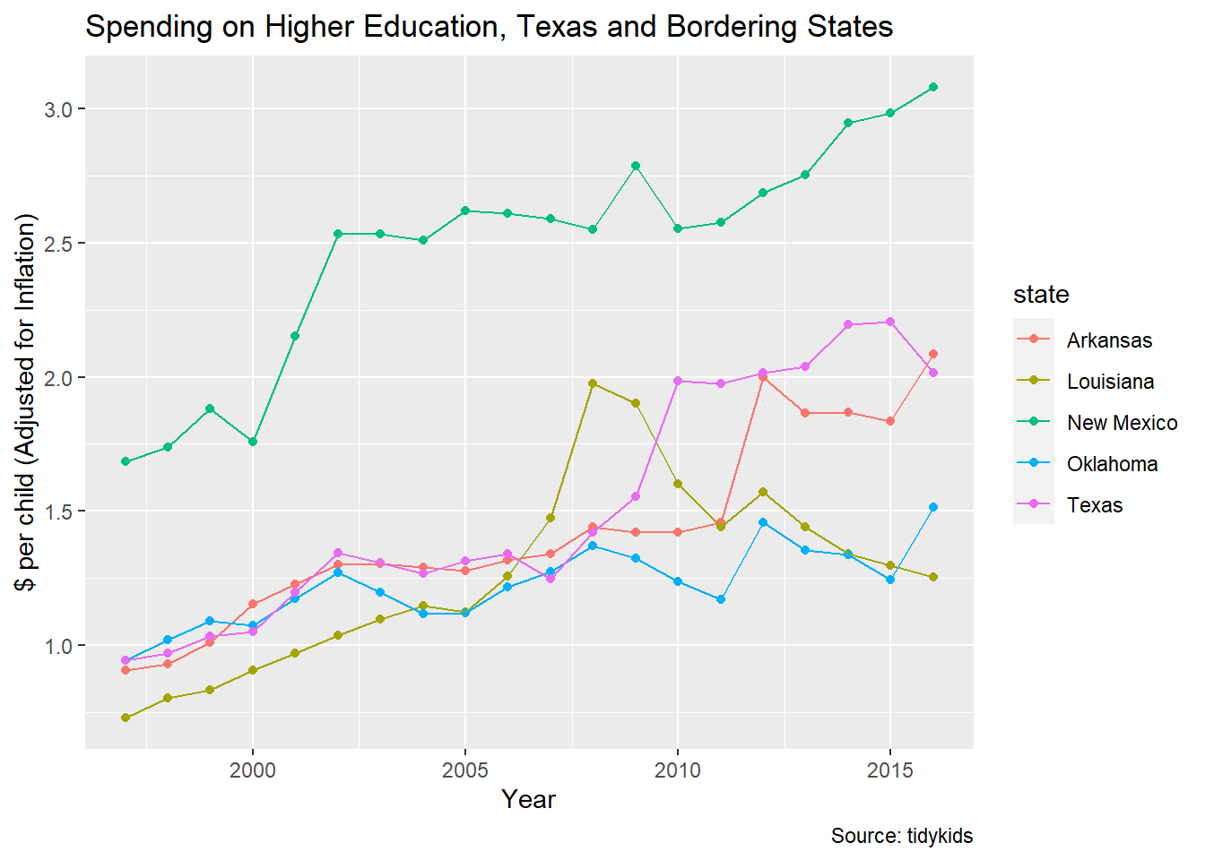 labs(title = "Spending on Higher Education, Texas and Bordering States",