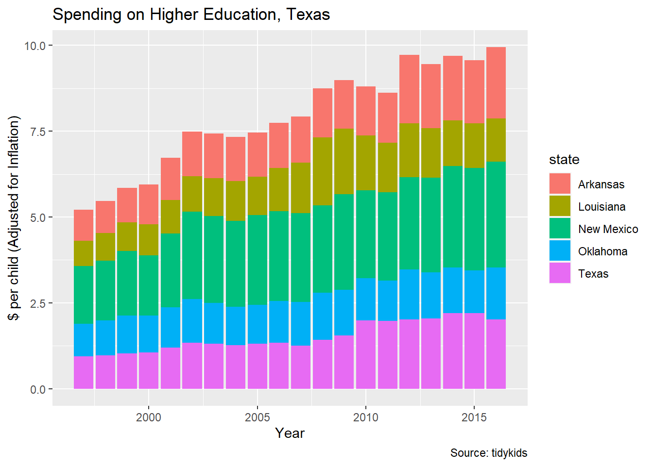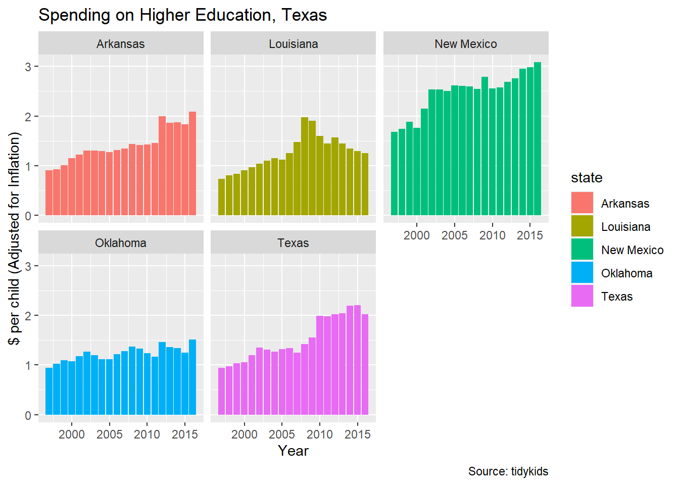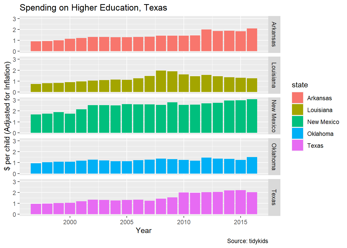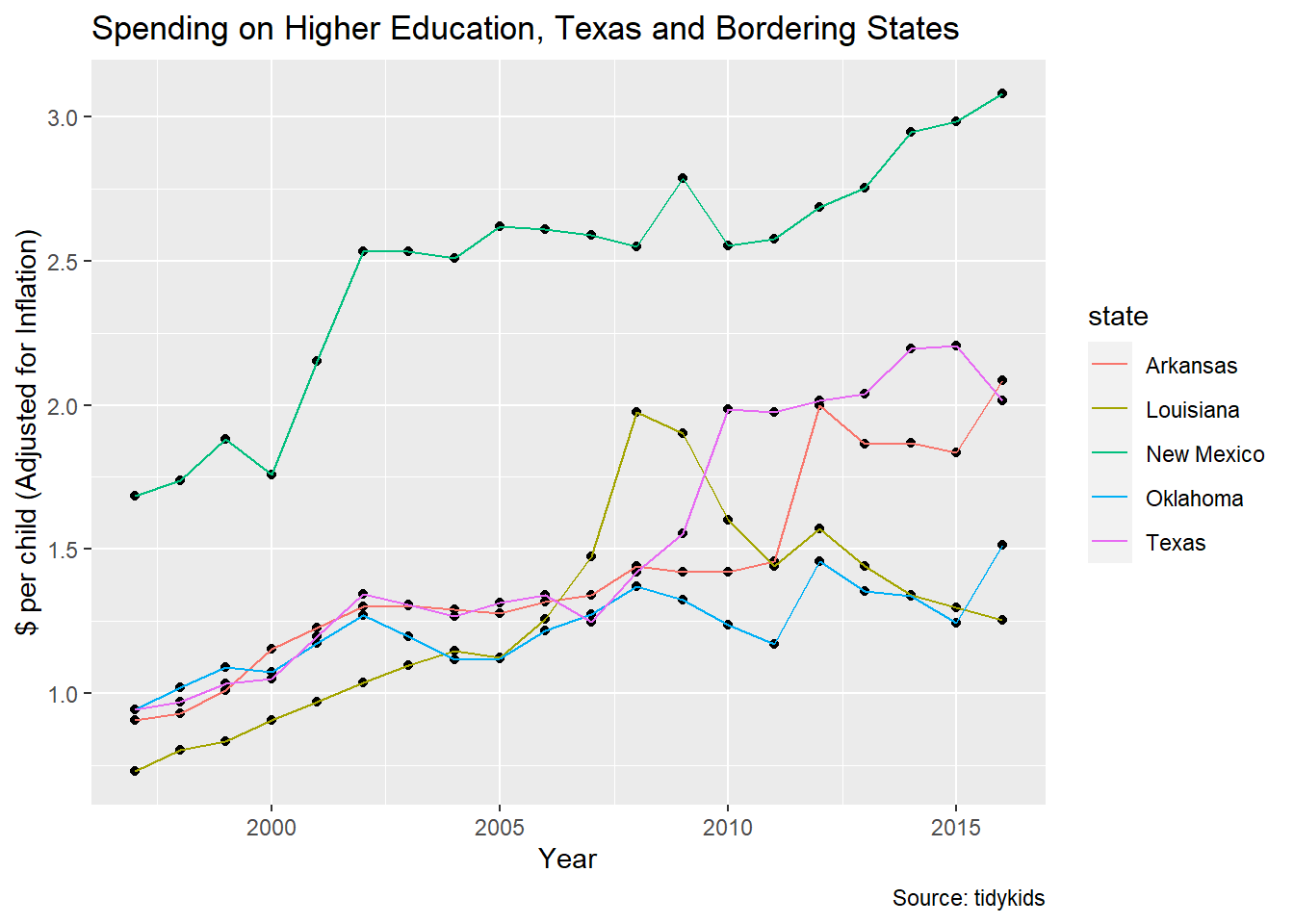 labs(title = "Spending on Higher Education, Texas and Bordering States",