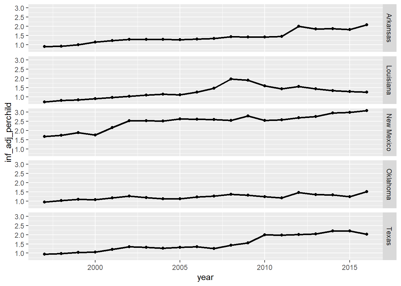 facet_plot <- ggplot(texas_adj_data, aes(x = year, y = inf_adj_perchild)) +
