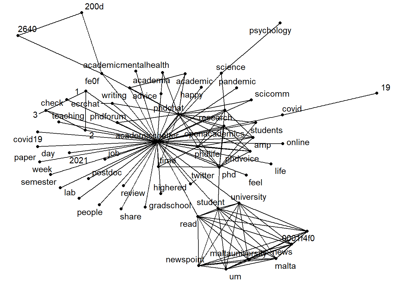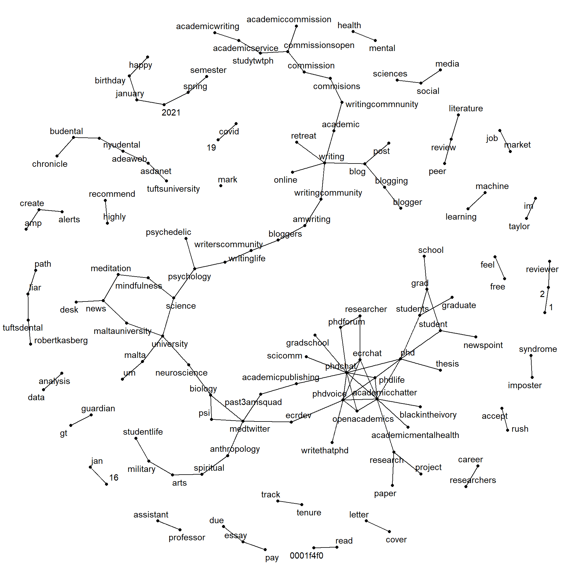 There’s a lot going on here, but we can see that hashtags (academicchatter, mentalhealth, phdchat) and common word-pairs (“reviewer 2” or “writing retreat”) appear in our analysis.