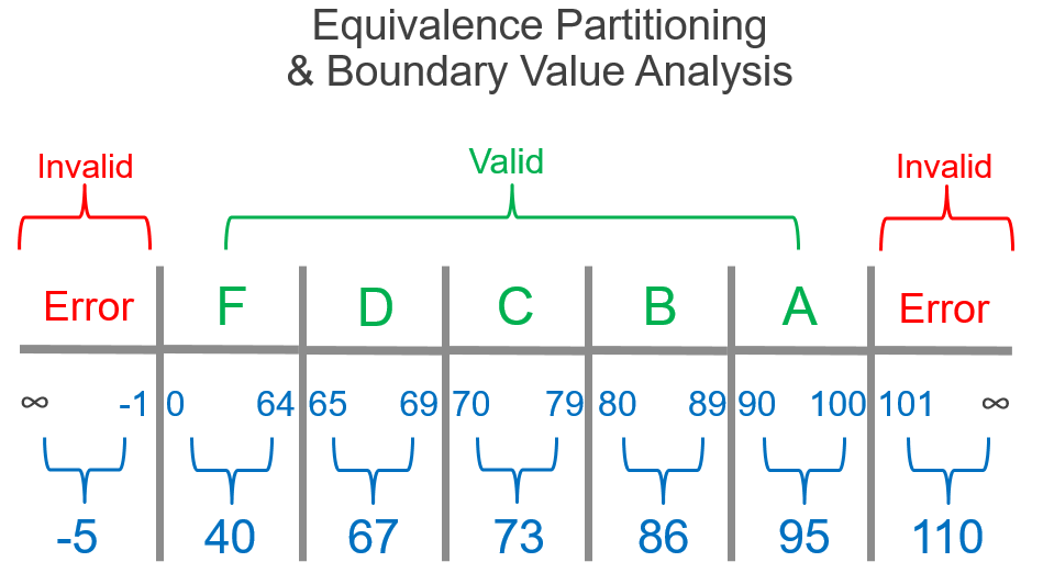 - This is an approach to reduce the total number of test cases to a finite set of testable test cases. It is a useful approach to making testing a structured method rather than a series of ad-hoc tests which may not cover important sources of error. Boundary analysis involves testing the extreme ends or boundaries between partitions of the input values. Equivalence Partitioning divides the input data into different equivalence data classes which can each be tested covering the full spectrum of possible values. An example is illustrative. The chart below shows an example of what to test for student grades, with certain values falling into grade classes, such as 70-79 being awarded a C grade. It would be time consuming to test every number so a Boundary Value Analysis & Equivalence Partitioning approach is taken. We want to test that a number in the grade category returns that award and that values below 0 or above 100 are invalid. This reduces the number of tests which need to be written to a pragmatic and proportionate level.