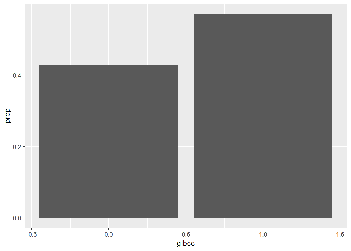 To start with proportions, We will use the glbcc variable from the class dataset that contains respondents’ opinions on global climate change. Specifically, it asks if they believe that greenhouse gases cause global temperatures to increase. We start with describing the data. A zero indicates “no” and 1 indicates “yes.”