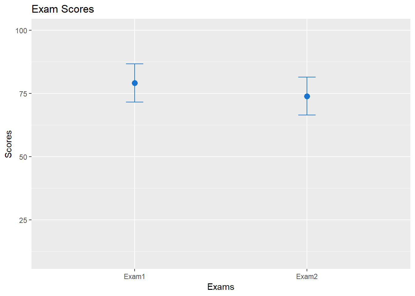 Now, for the visualization. Instead of a bar plot, we will create a graph consisting of a point for the means for each exam, and the confidence intervals. In additional, we will add color and labels. These arguments are available for other data sets and visualizations using ggplot2: