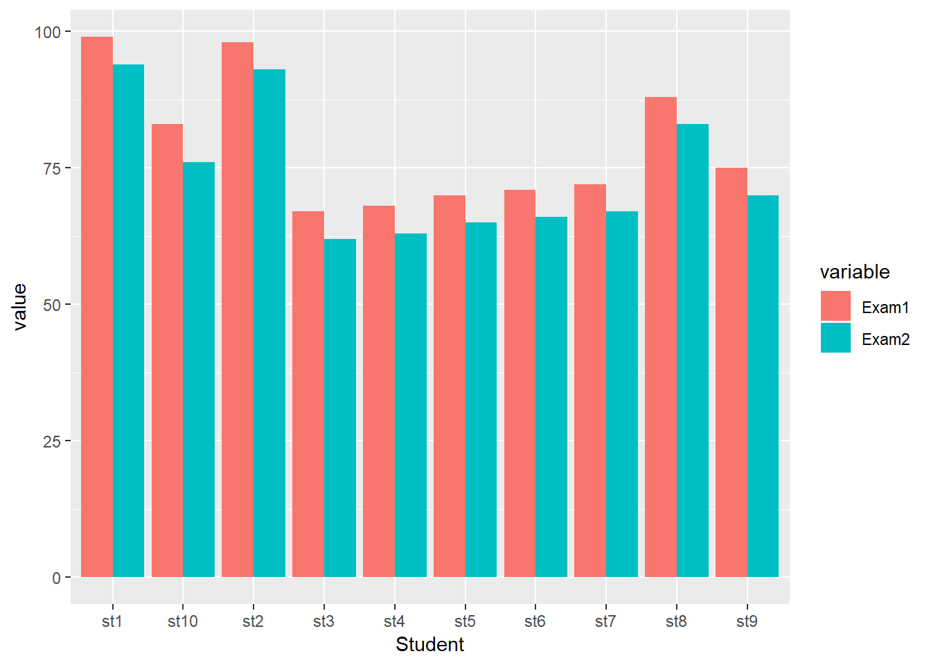 The grouped bar plot is constructed similar to a bar plot, except that the visualization is based on the exam and uses the position.dodge() function to place bars near each other and the fill=Exam argument to specify what the groups