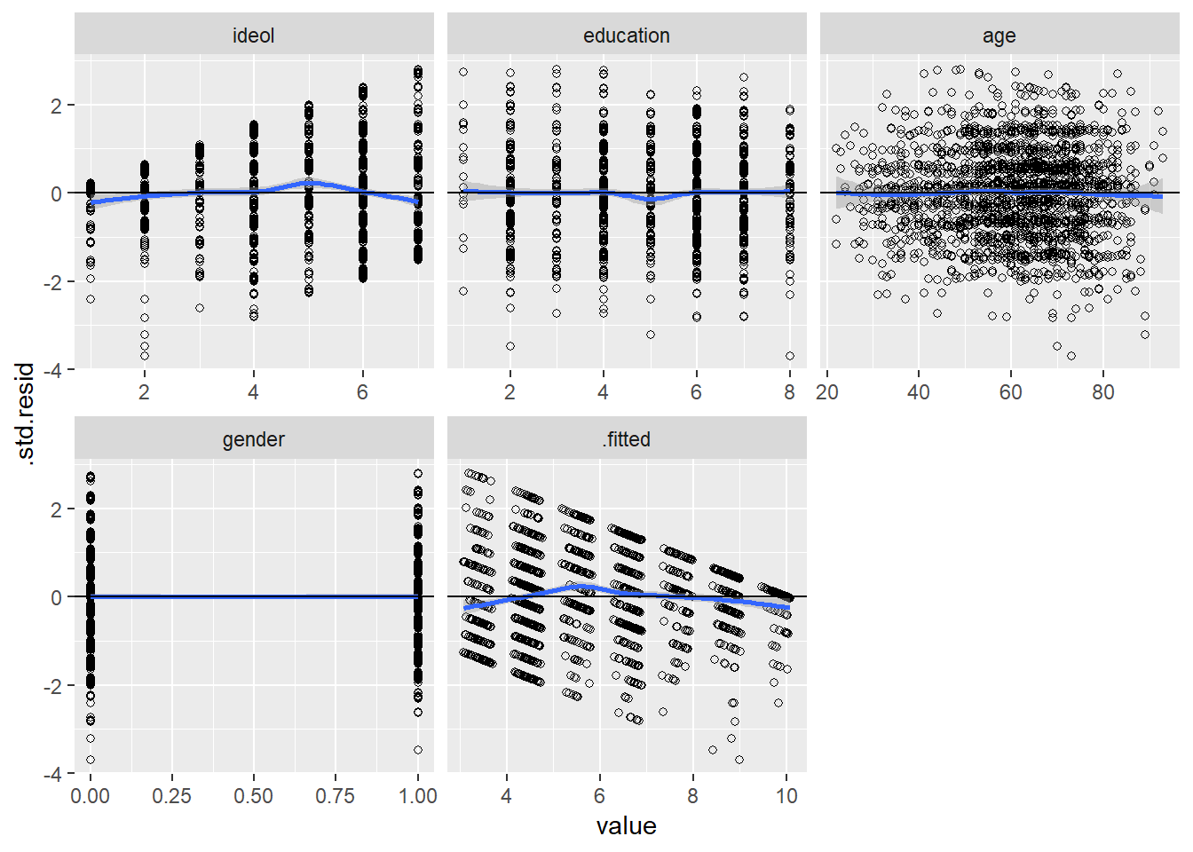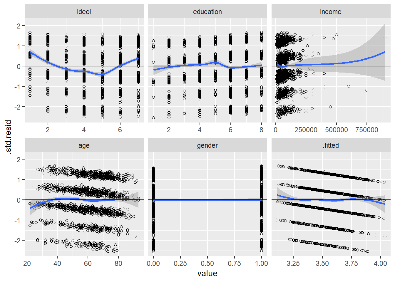 Based on the p-values for the model variables, the ideology variable does not appear to help us understand what candidate the responded supported; however, we should examine the linearity of the variables. One way to do this is to plot the residuals by the values of the independent variables. Residual relationships should constitute a straight line with the residuals spread around a line at zero. To build this visualization we need to: