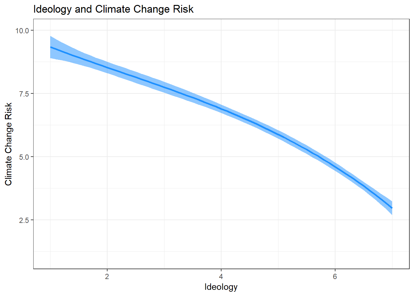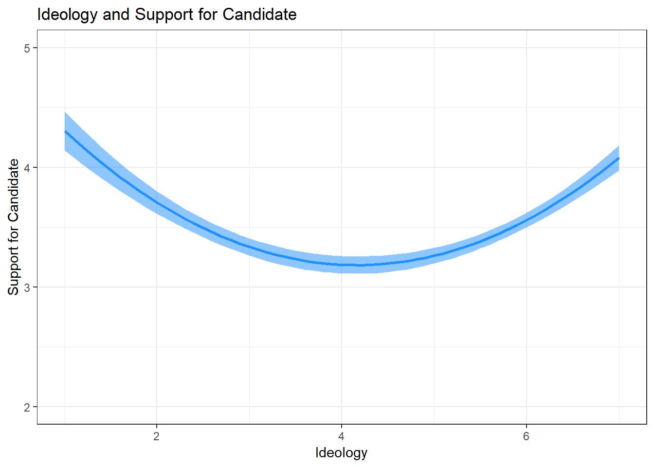 For example, when thinking about how ideology might influence candidate support, you could imagine this might be an instance when a quadratic model would be appropriate. Think about it: it wouldn’t make sense to theorize that the more conservative an individual, the more enthusiastic they were for the candidate they voted for (regardless of who the candidate was), but it does make sense to theorize that the more ideologically extreme an individual is (very liberal or very conservative) the more they supported the candidate they voted for. Perhaps the moderates voting in the 2016 election felt left our or alienated by the polarized political environment, and therefore might have had less support for the candidate they voted for.
