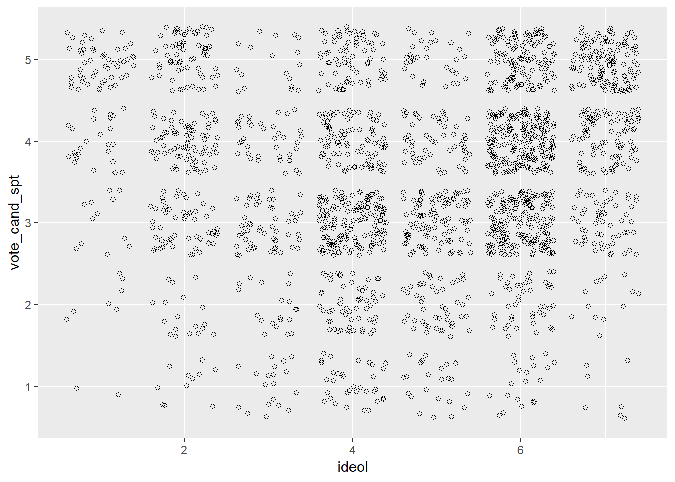 A critical assumption of OLS is that the relationship between variables is linear in their functional form, therefore it is imperative to inspect whether a model consist of non-linear relationships between variables of interest. As the book describes, regression diagnostics is largely an art. To demonstrate, suppose you want to examine the relationship between ideology and candidate support in the 2016 presidential election. The survey associated with the class data set asked respondents to indicate on a scale of 1 to 5 the level of support they have for the candidate they voted for in the 2016 presidential election. We will start by exploring data in preparation for a linear regression model:
