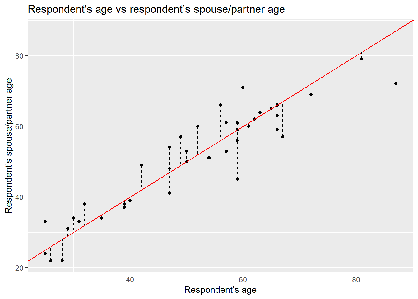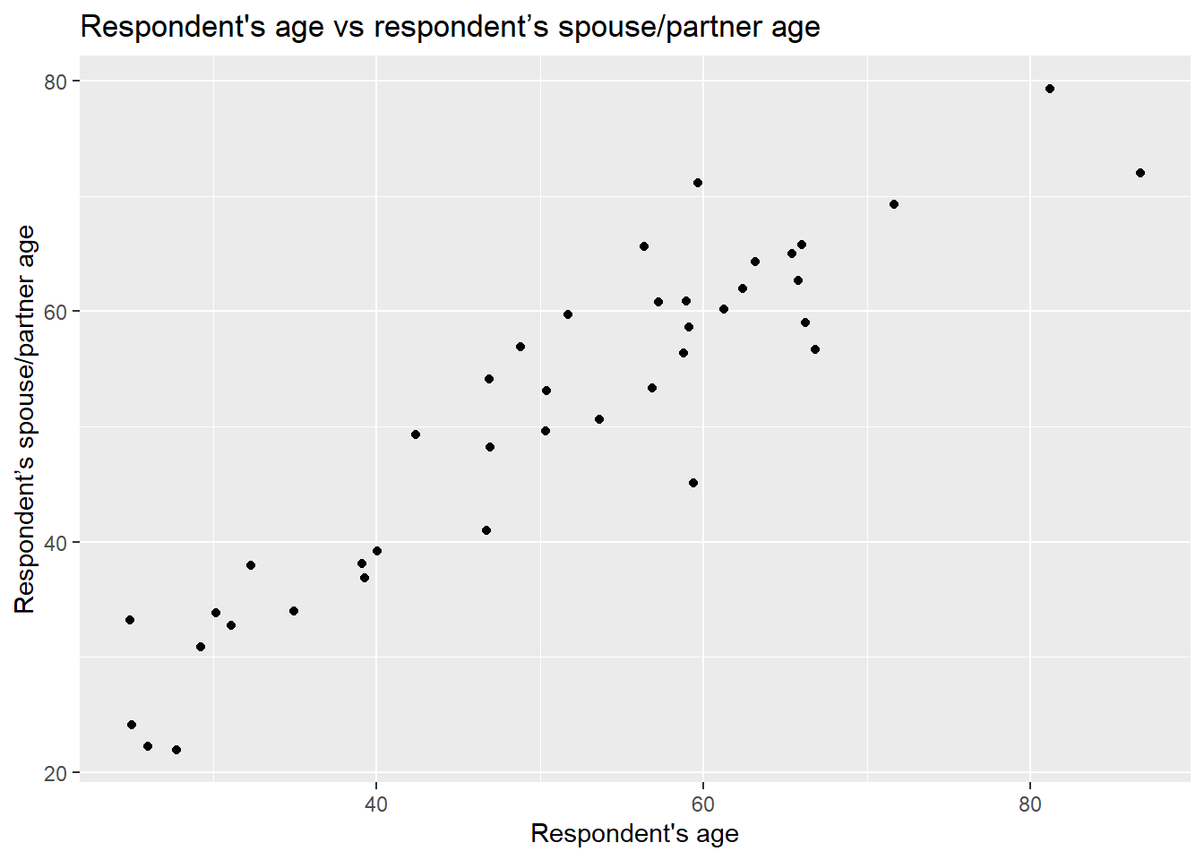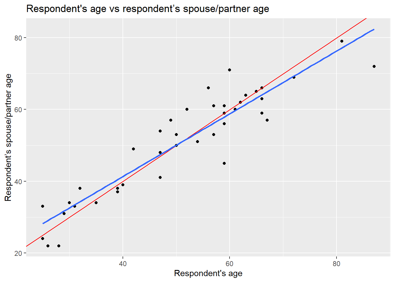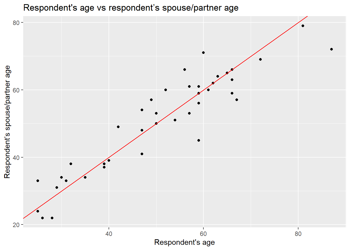 x = "Respondent's age", y = "Respondent’s spouse/partner age" )