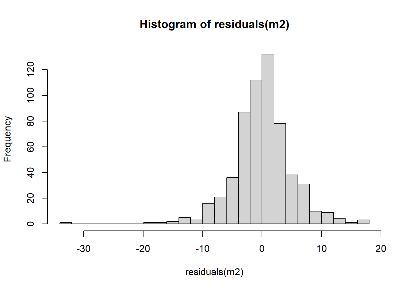 Does the residuals follow a normal distribution in m1? We can go further and plot a histogram to graphically evaluate it. Use the function residuals() to extract the residuals from our object m2, and then plot a histogram with the r-base function hist().