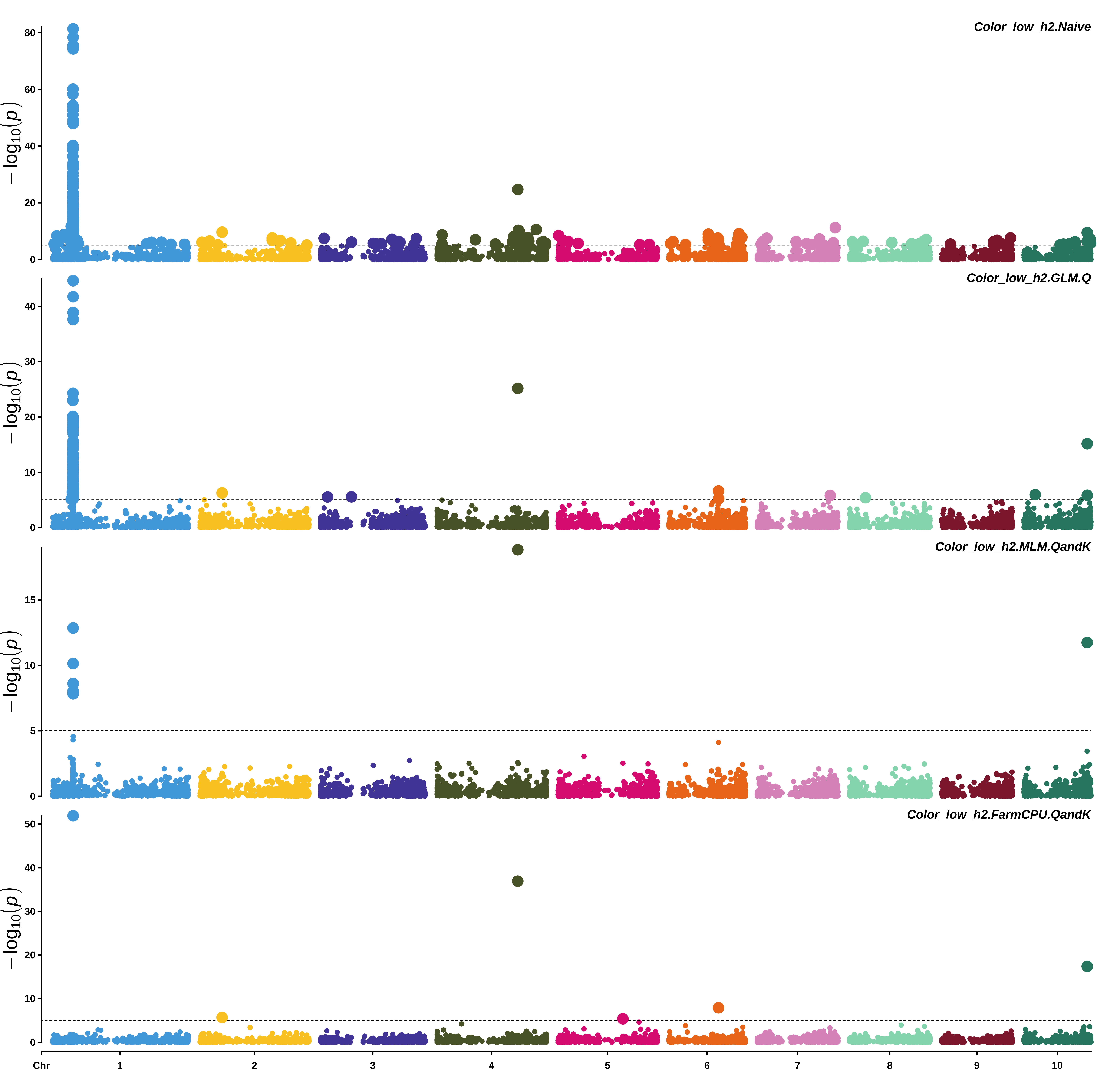 memo = "LOW_models")From top to bottom, manhattan plots are for a Naive model (T-test), GLM model accounting for (Q), MLM model accounting for (Q) and (K), FarmCPU model accounting for (Q) and (K).