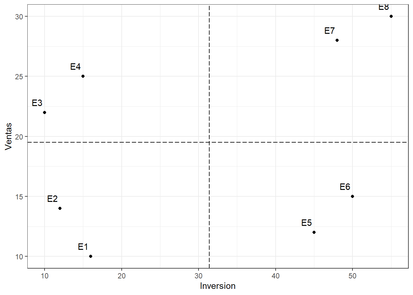 ggplot(datos,aes(x=Inversion,y=Ventas)) +