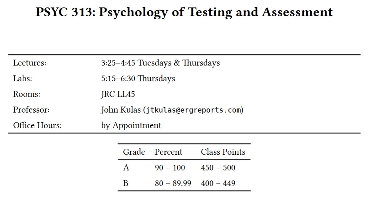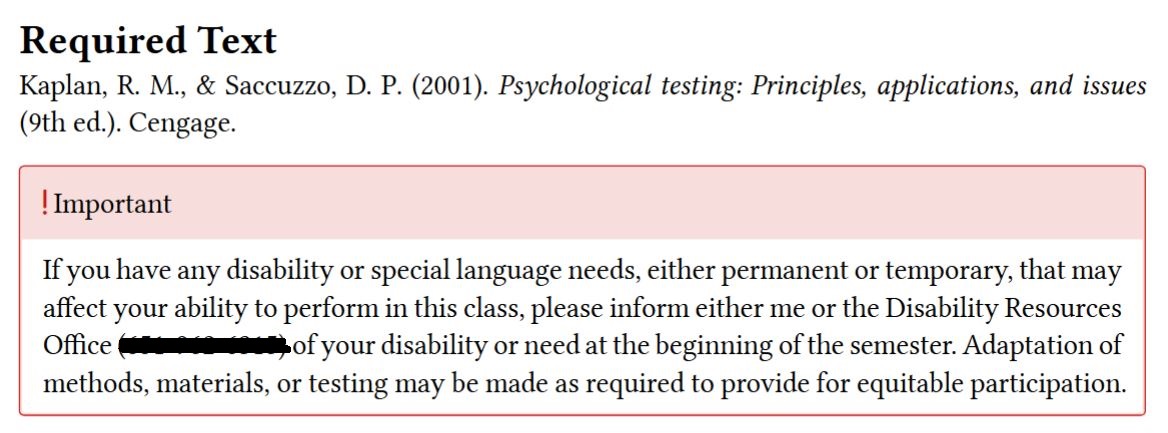 ---title:"PSYC 313: Psychology of Testing and Assessment"format: typst: bibliography: classbib.bib csl: apa-cv (1).csl suppress-bibliography: true citeproc: true---## Required Text@kaplan2001psychological::: {.callout-important}If you have any disability or special language needs, either permanent or temporary, that may affect your ability to perform in this class, please inform either me or the [Disability Resources Office](https://www.stthomas.edu/student-life/resources/disability/) (651-962-6315) of your disability or need at the beginning of the semester. Adaptation of methods, materials, or testing may be made as required to provide for equitable participation.:::#