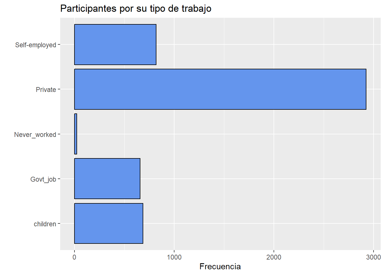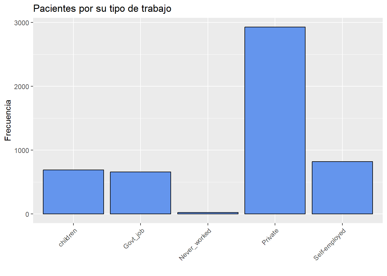 Se utiliza el paquete tidyverse para calcular el porcentaje de cada tipo de trabajo del dataset que le pusimos “heart”. El código agrupa los datos según la columna “work_type”, cuenta las ocurrencias de cada tipo, quita la agrupación de los datos y luego calcula el porcentaje para cada tipo de trabajo.