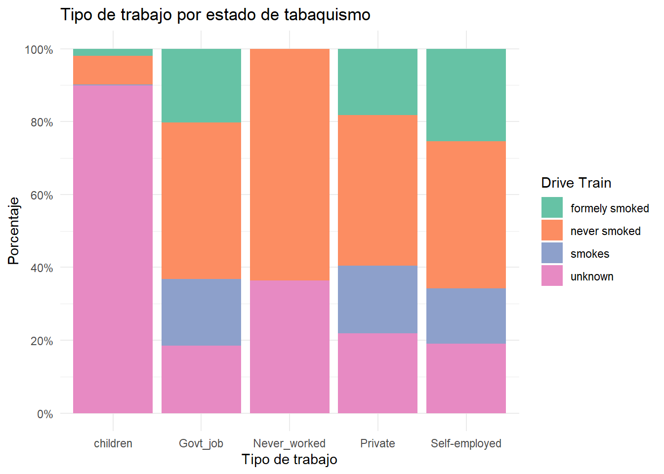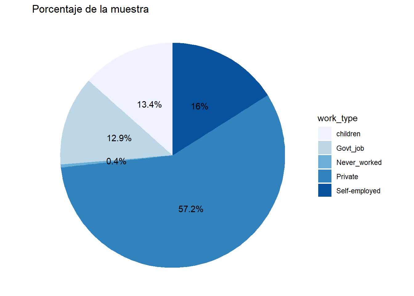 mutate(porcentaje = n/sum(n)*100)Se utiliza ggplot2 para crear un gráfico circular. Toma los datos de “porcentaje_work_type” y mapea el porcentaje en el eje y, utilizando el tipo de trabajo para diferenciar las barras. Además, agrega etiquetas de porcentaje en cada barra.