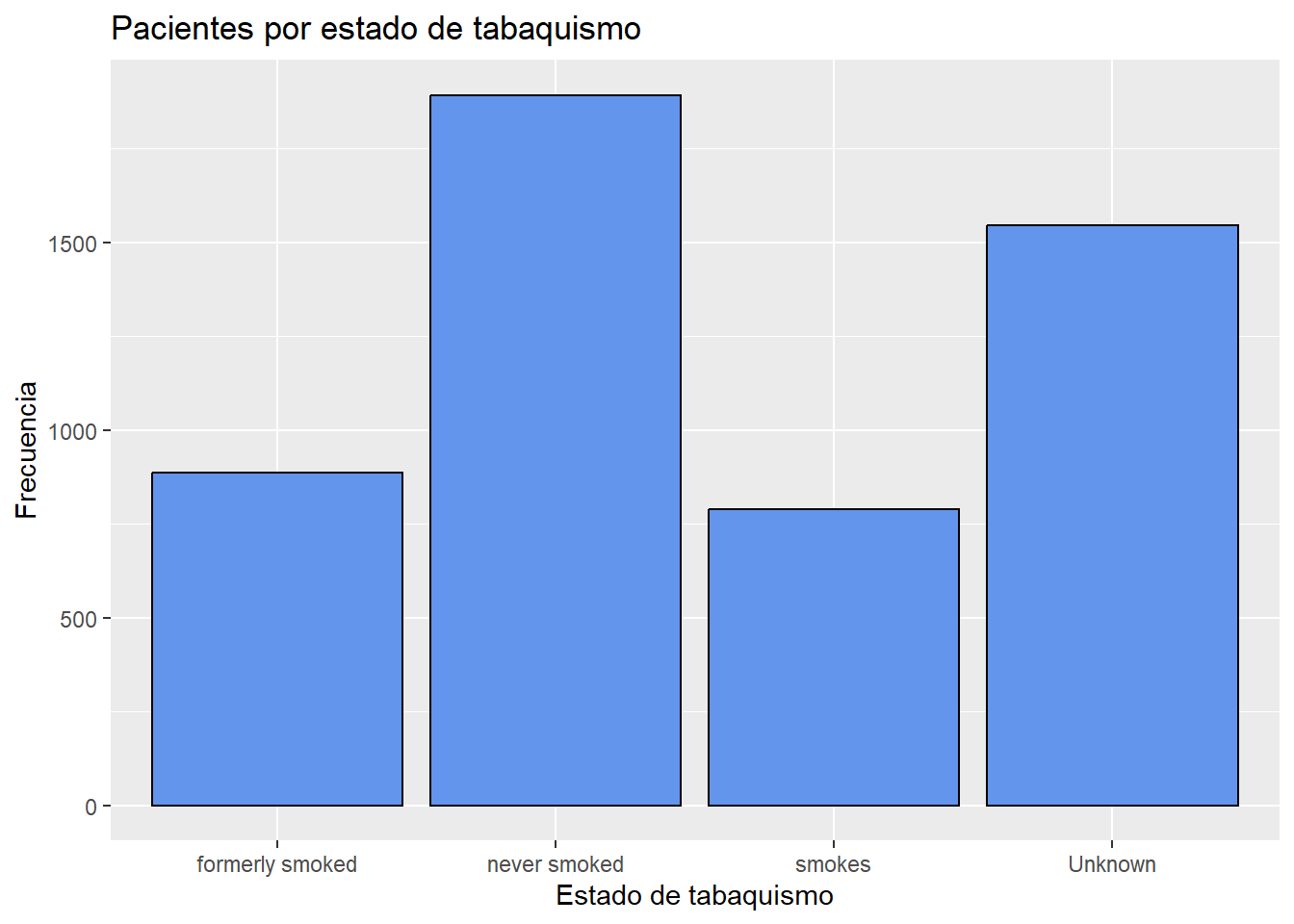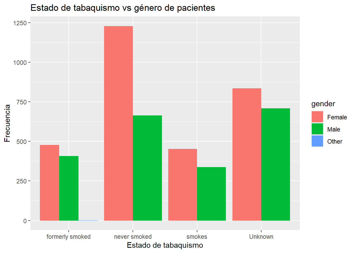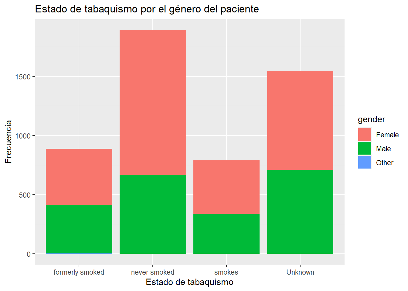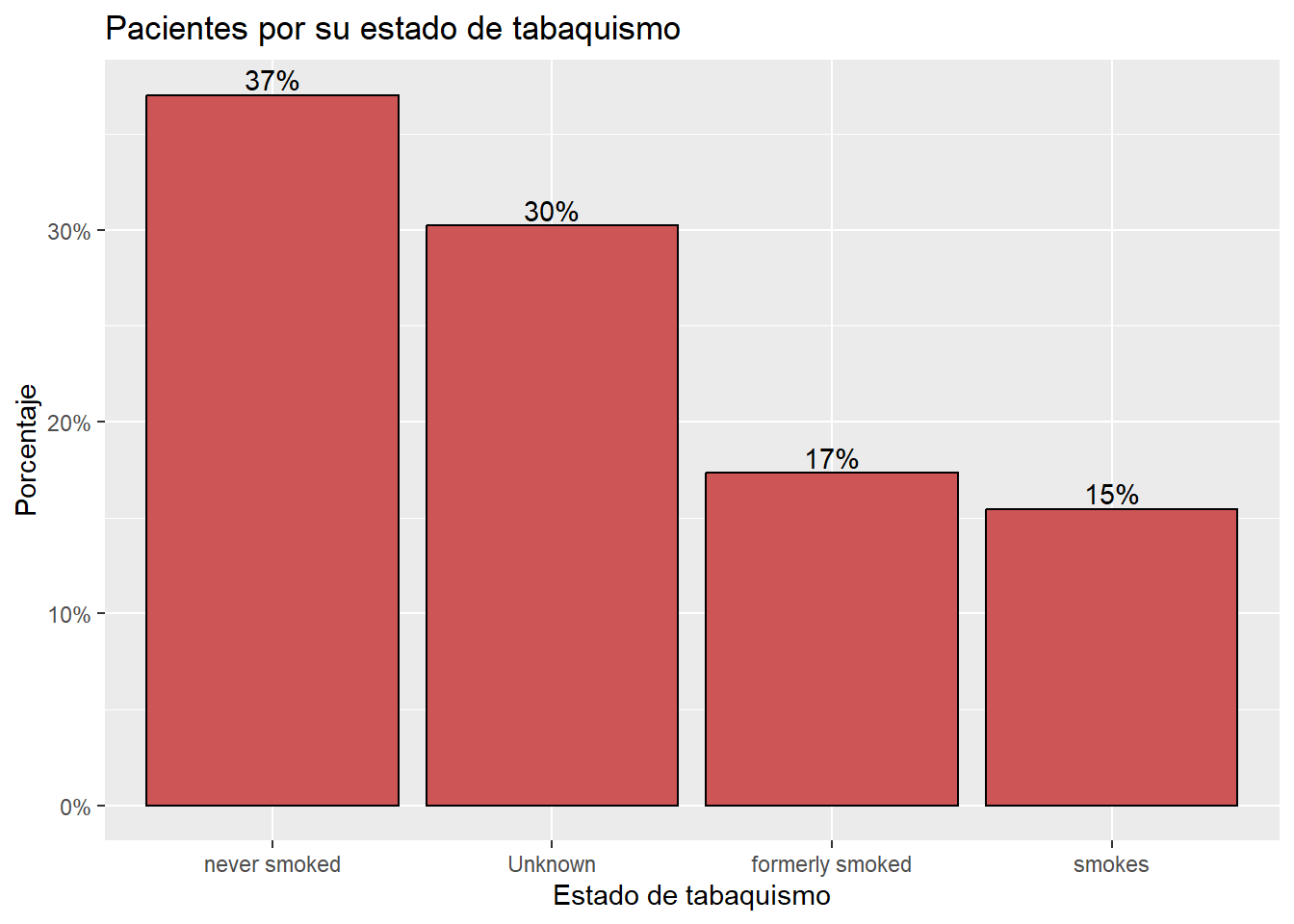 Podemos notar que la mayor cantidad de pacientes nunca ha fumado seguido por los que se desconoce su estado.