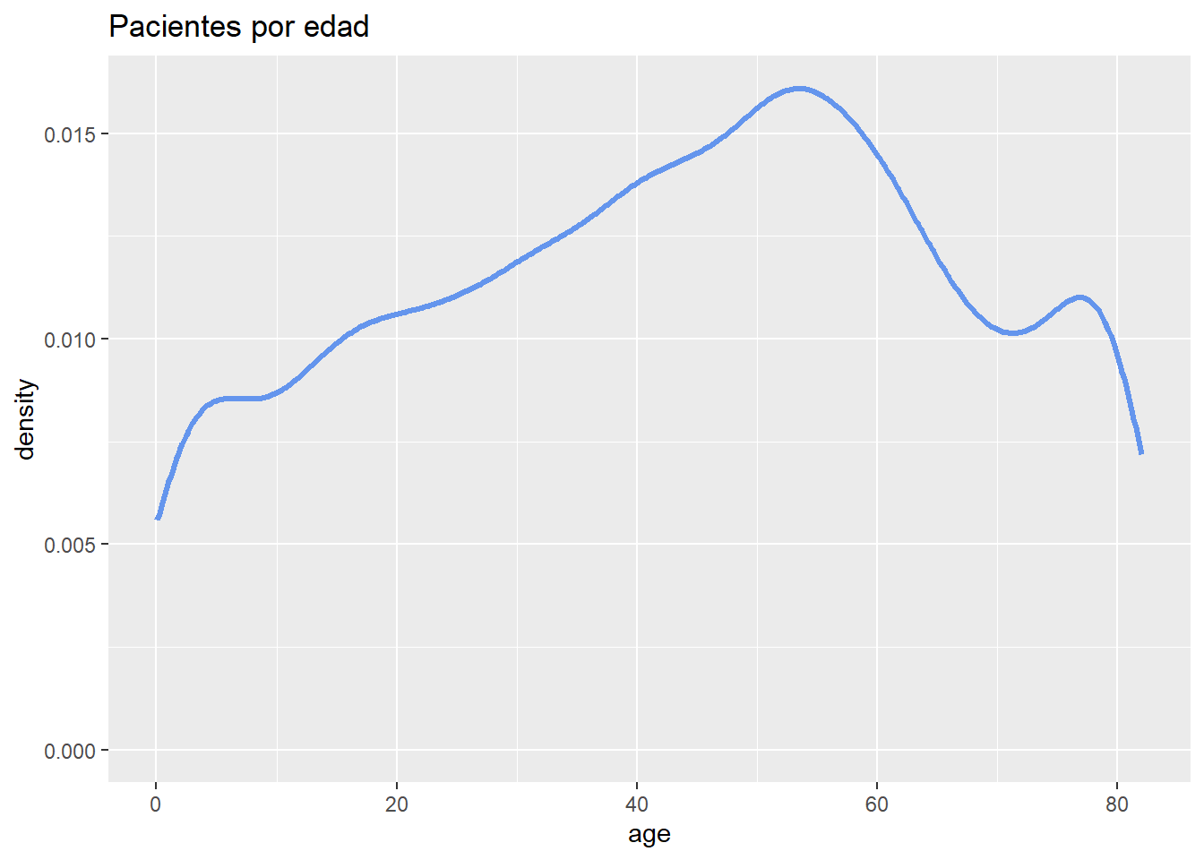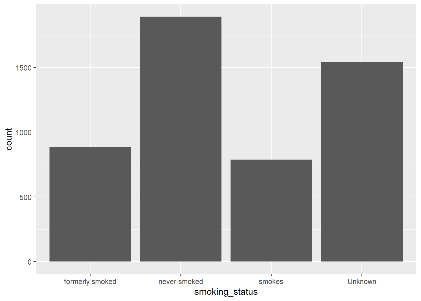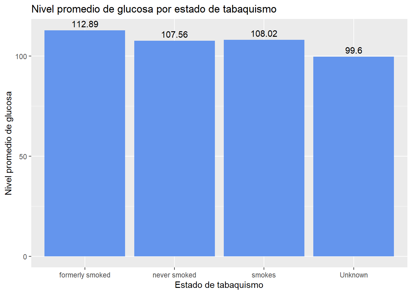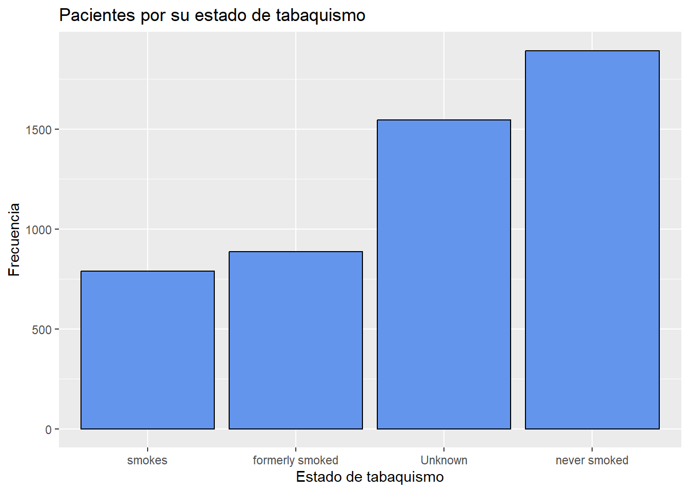 Podemos notar que la mayor cantidad de pacientes nunca ha fumado seguido por los que se desconoce su estado.