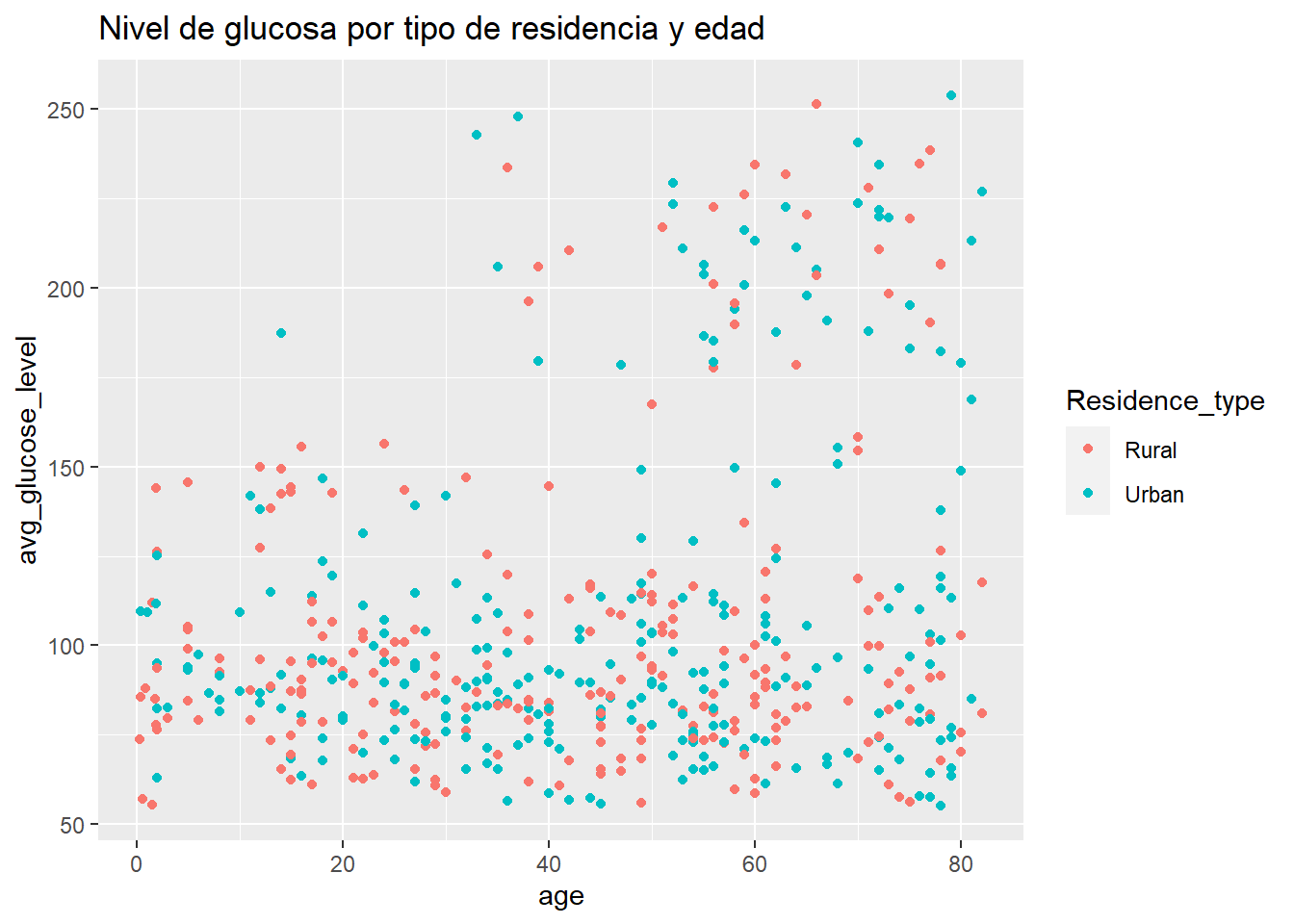 # Gráfico edad vs nivel de glucosa, color por tipo de residencia