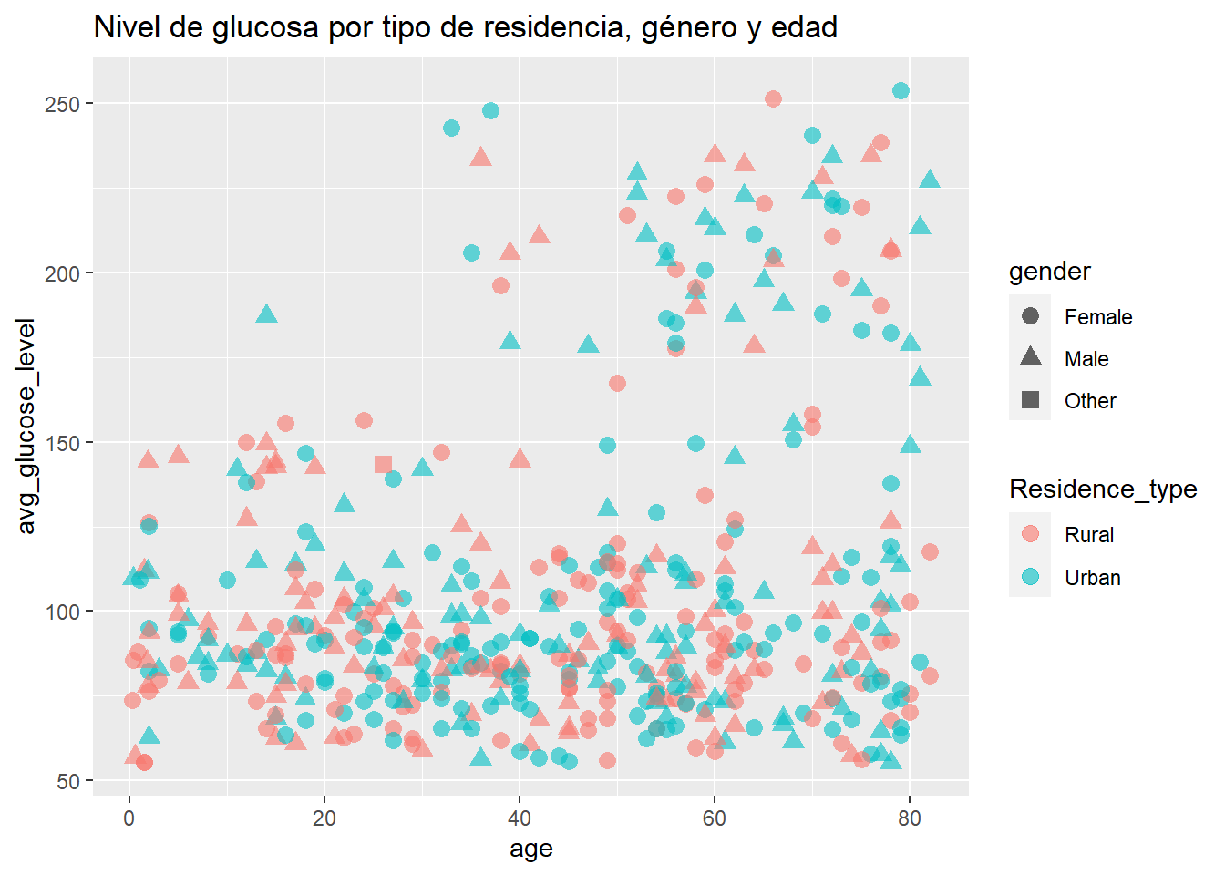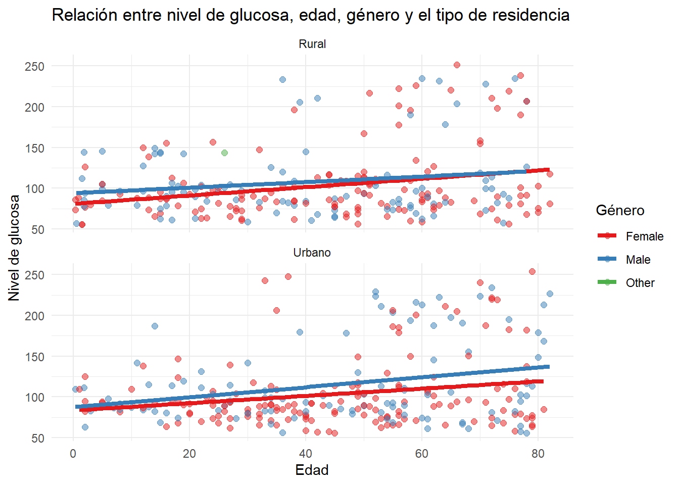 # Gráfico del nivel de glucosa por edad, género y tipo de residencia