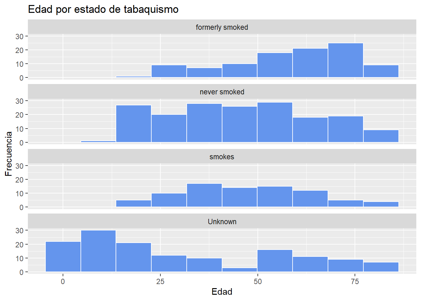 # Gráfico de histogramas de edad por estado de tabaquismo