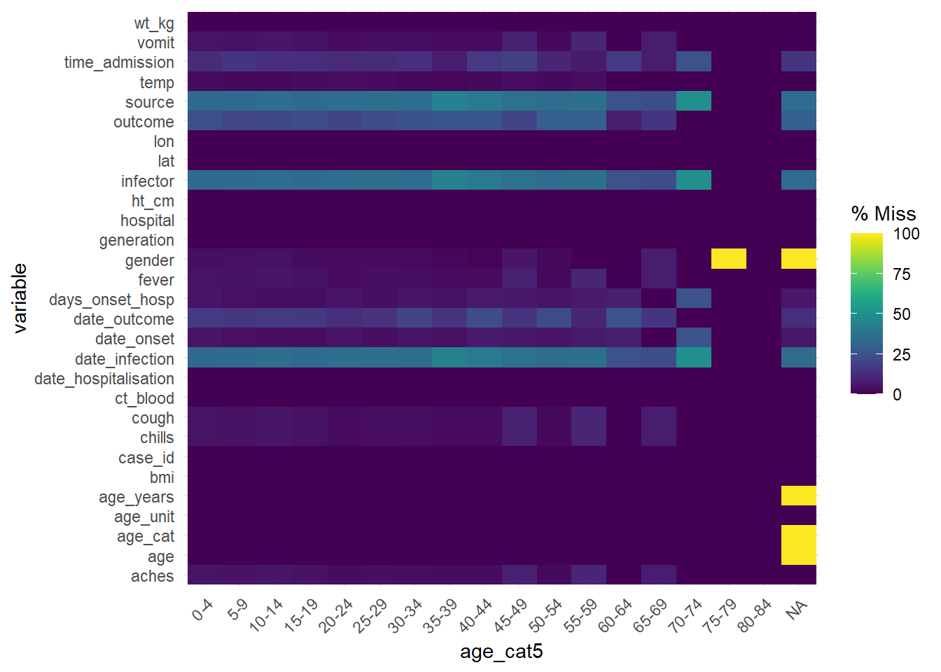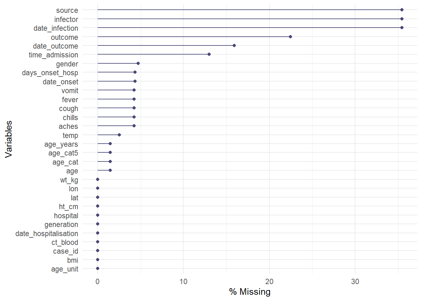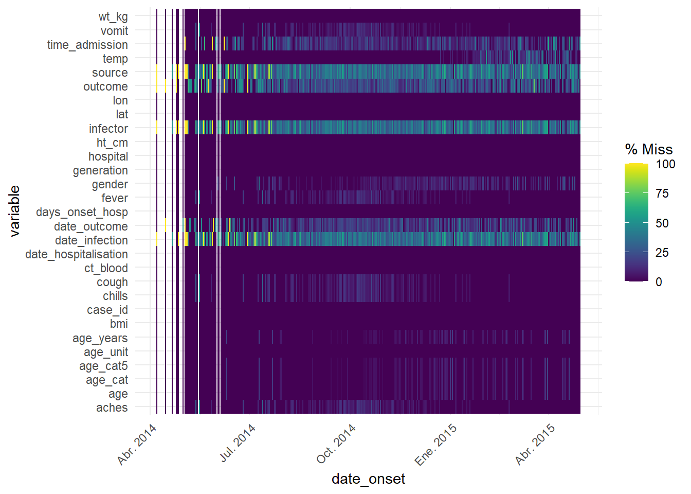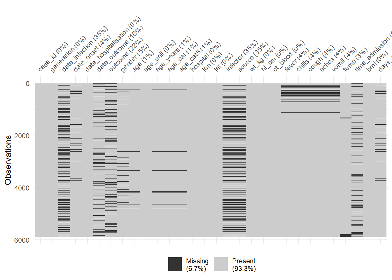 tail(linelist) case_id generation date_infection date_onset date_hospitalisation