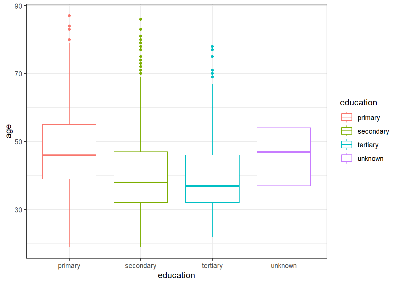 ggplot(data = banco, aes(x = education, y = age, color = education))+