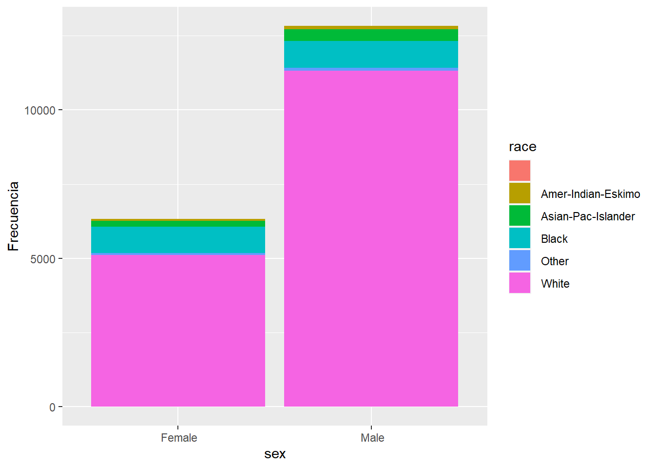 ggplot(data=datosAdult[],aes(x=sex,fill=race))+geom_bar()+ylab("Frecuencia")