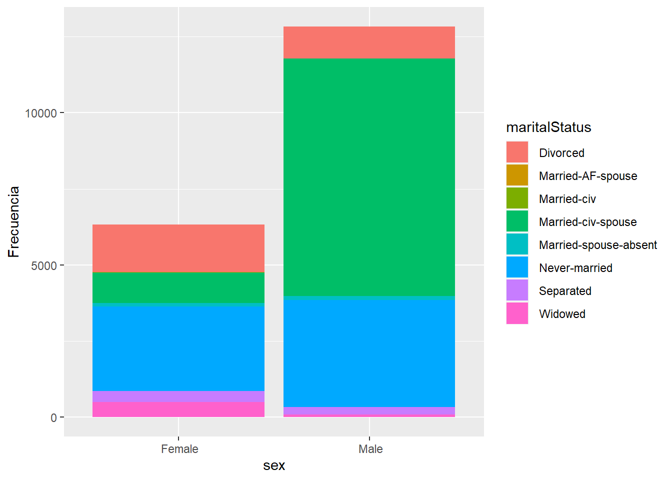 ggplot(data=datosAdult[],aes(x=sex,fill=maritalStatus))+geom_bar()+geom_bar(position="fill")+ylab("Frecuencia")