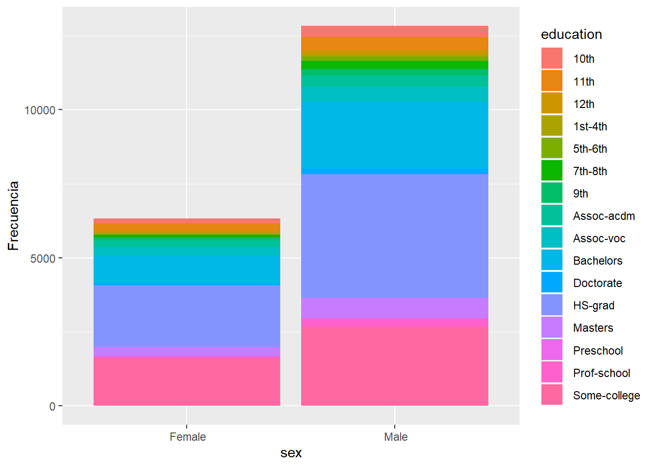 ggplot(data=datosAdult[],aes(x=sex,fill=education))+geom_bar()+geom_bar(position="fill")+ylab("Frecuencia")