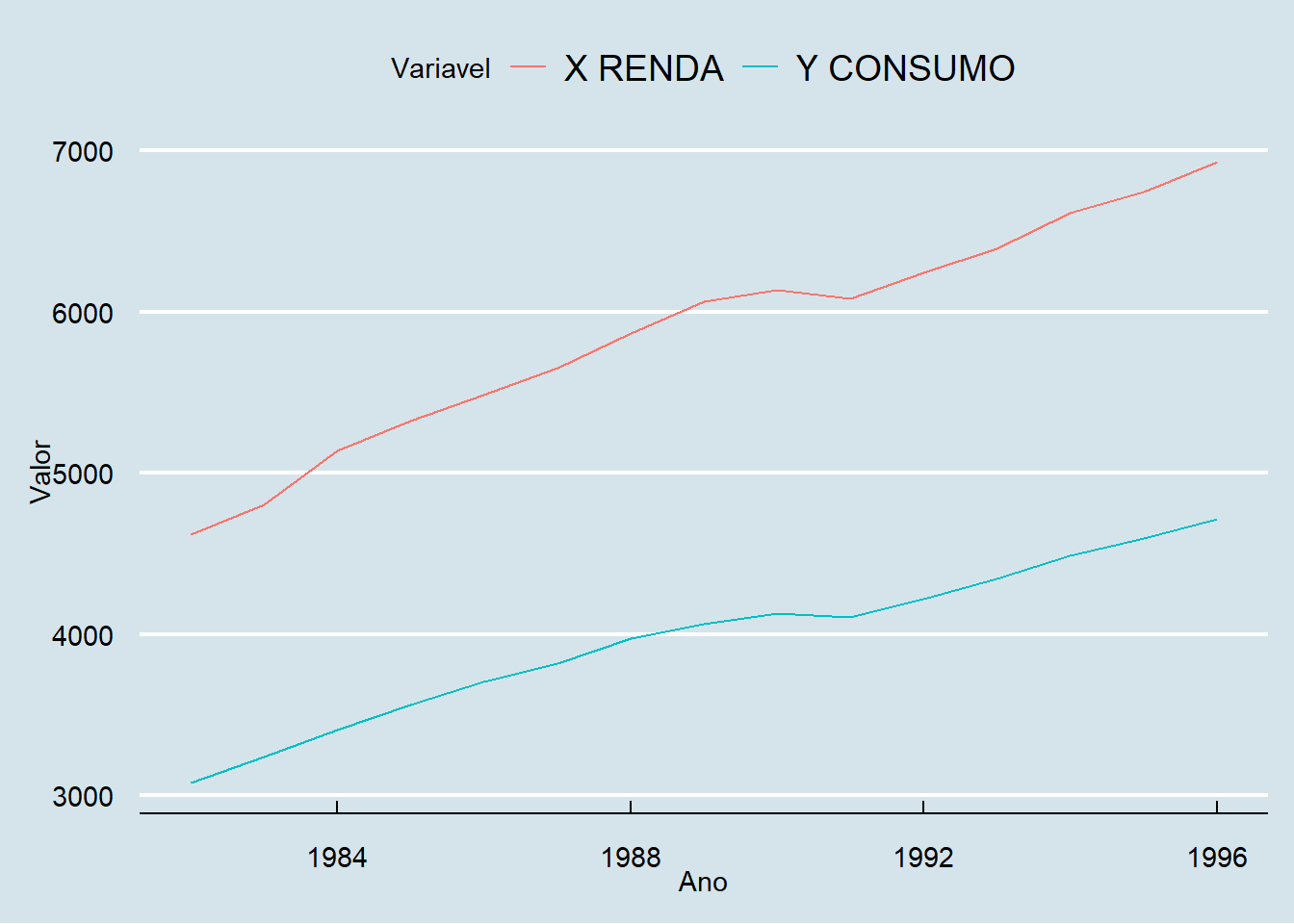 Um gráfico da renda e do consumo ao longo dos anos usando ggplot2: