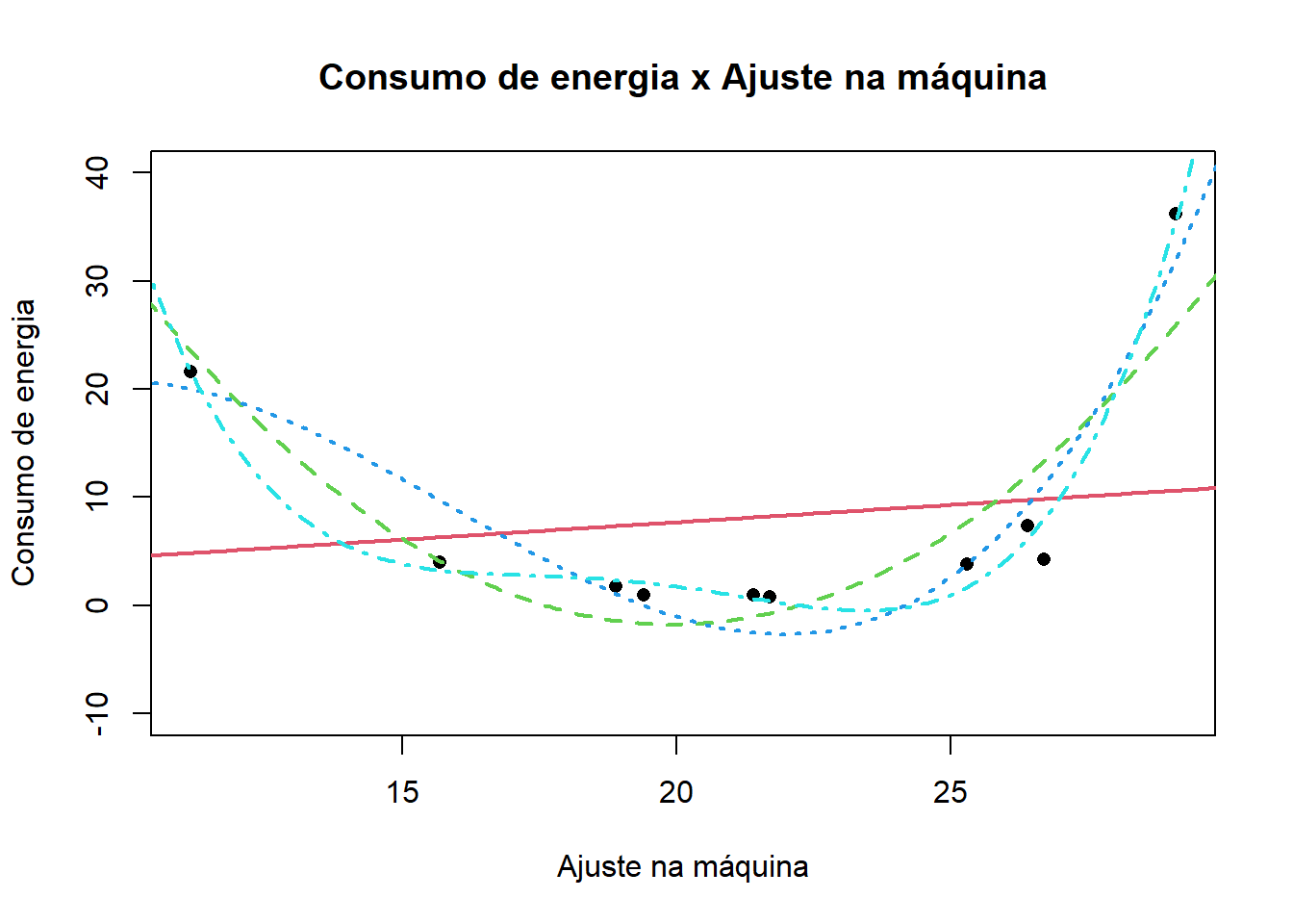 modelEner04 = lm(`Consumo de energia`~`Ajuste na maquina` + I(`Ajuste na maquina`^2) + I(`Ajuste na maquina`^3)+ I(`Ajuste na maquina`^4), data = dados02) Gráfico do ajuste dos modelos:
