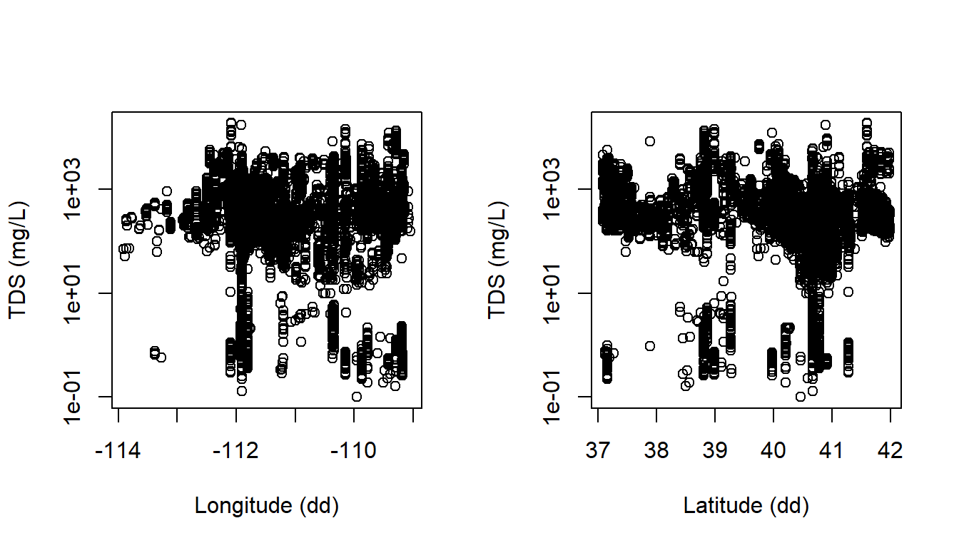 plot(ResultMeasureValue~LongitudeMeasure, tds_sites_uses, xlab="Longitude (dd)", ylab="TDS (mg/L)", log='y')