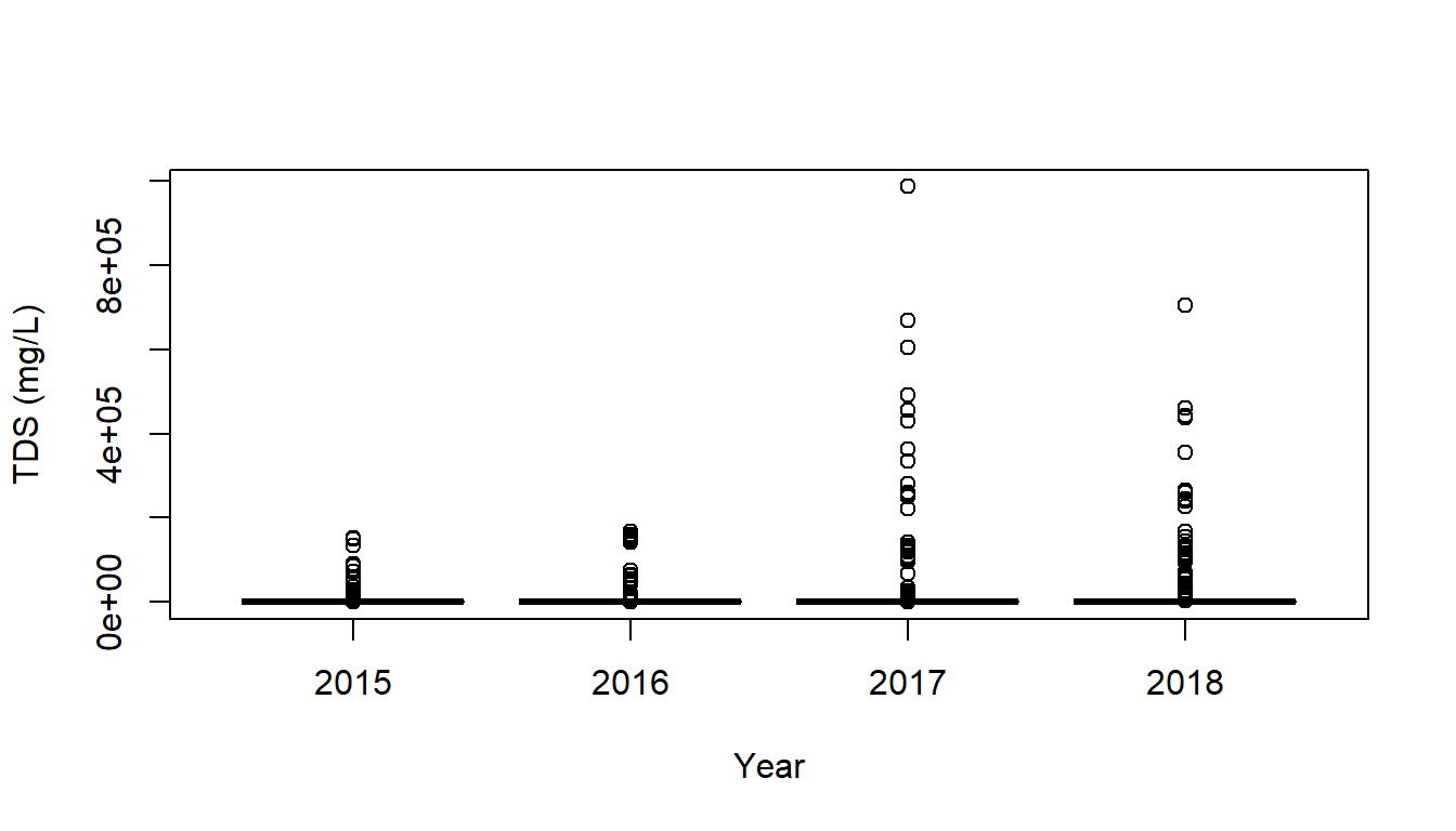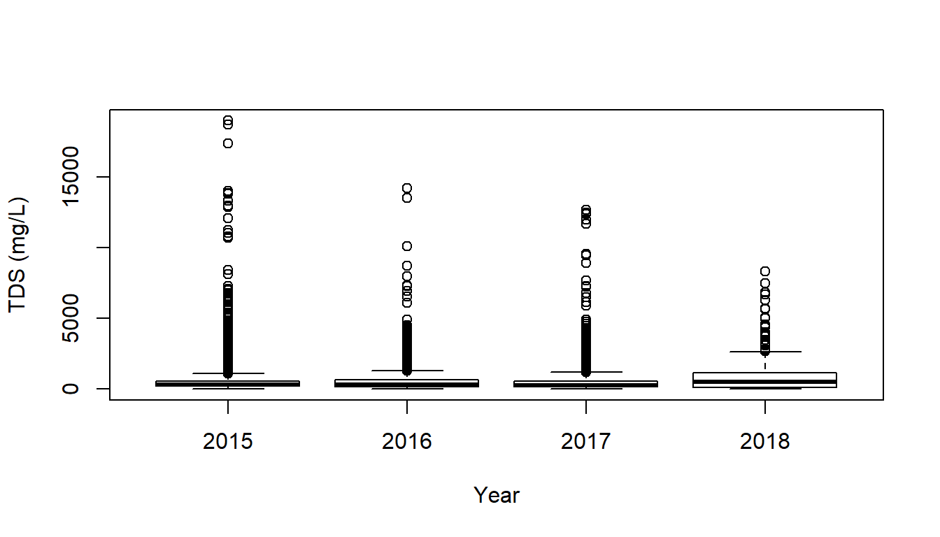 boxplot(ResultMeasureValue~year,tds_sites_uses, ylab="TDS (mg/L)", xlab="Year")