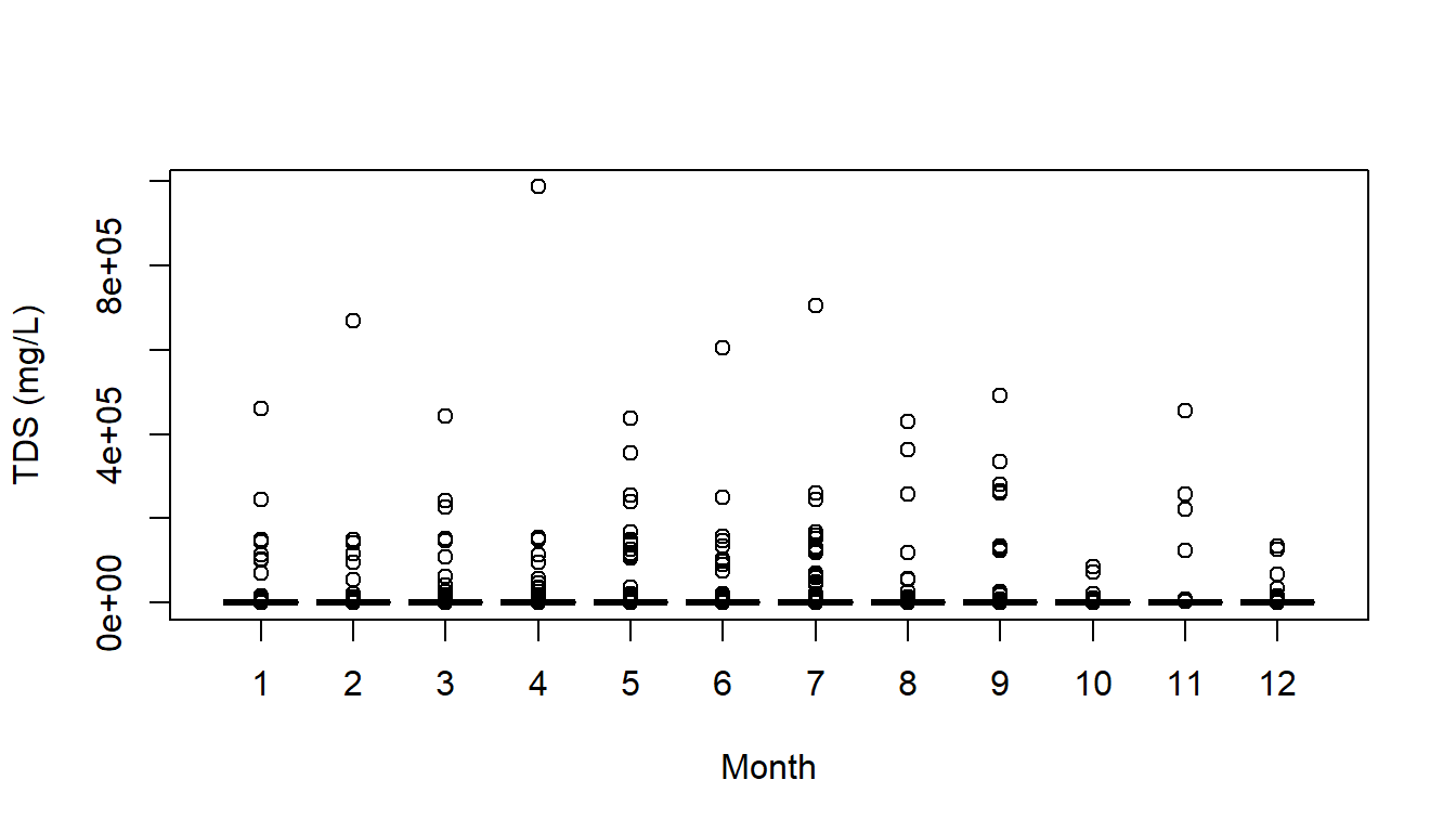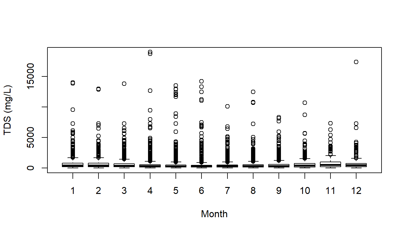 boxplot(ResultMeasureValue~month,tds_sites_uses, ylab="TDS (mg/L)", xlab="Month")