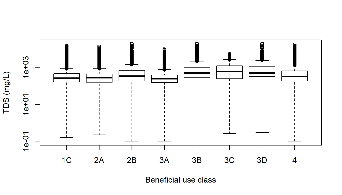 boxplot(ResultMeasureValue~BeneficialUse, tds_sites_uses, ylab="TDS (mg/L)", log='y', xlab="Beneficial use class")