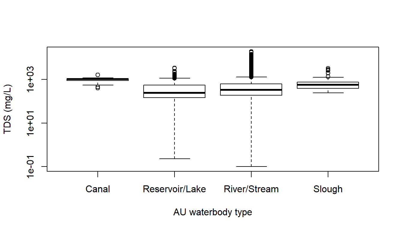 boxplot(ResultMeasureValue~AU_Type, tds_sites_uses, log='y', ylab="TDS (mg/L)", xlab="AU waterbody type")