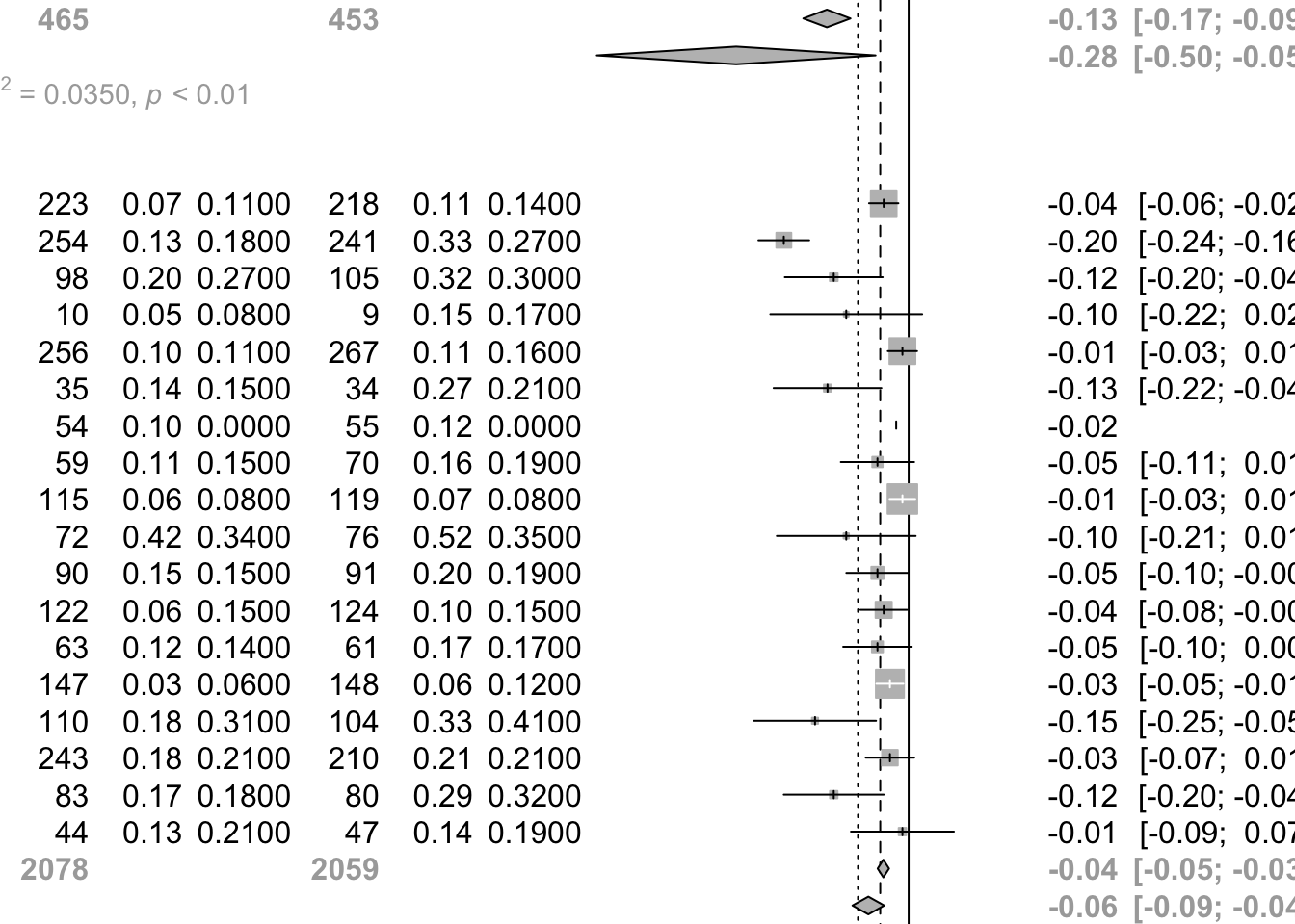 round(c(SMD, SMD + c(-1, 1) * qnorm(1 - (0.05 / 2)) * seSMD), 2)[1] -0.60 -1.33 0.13