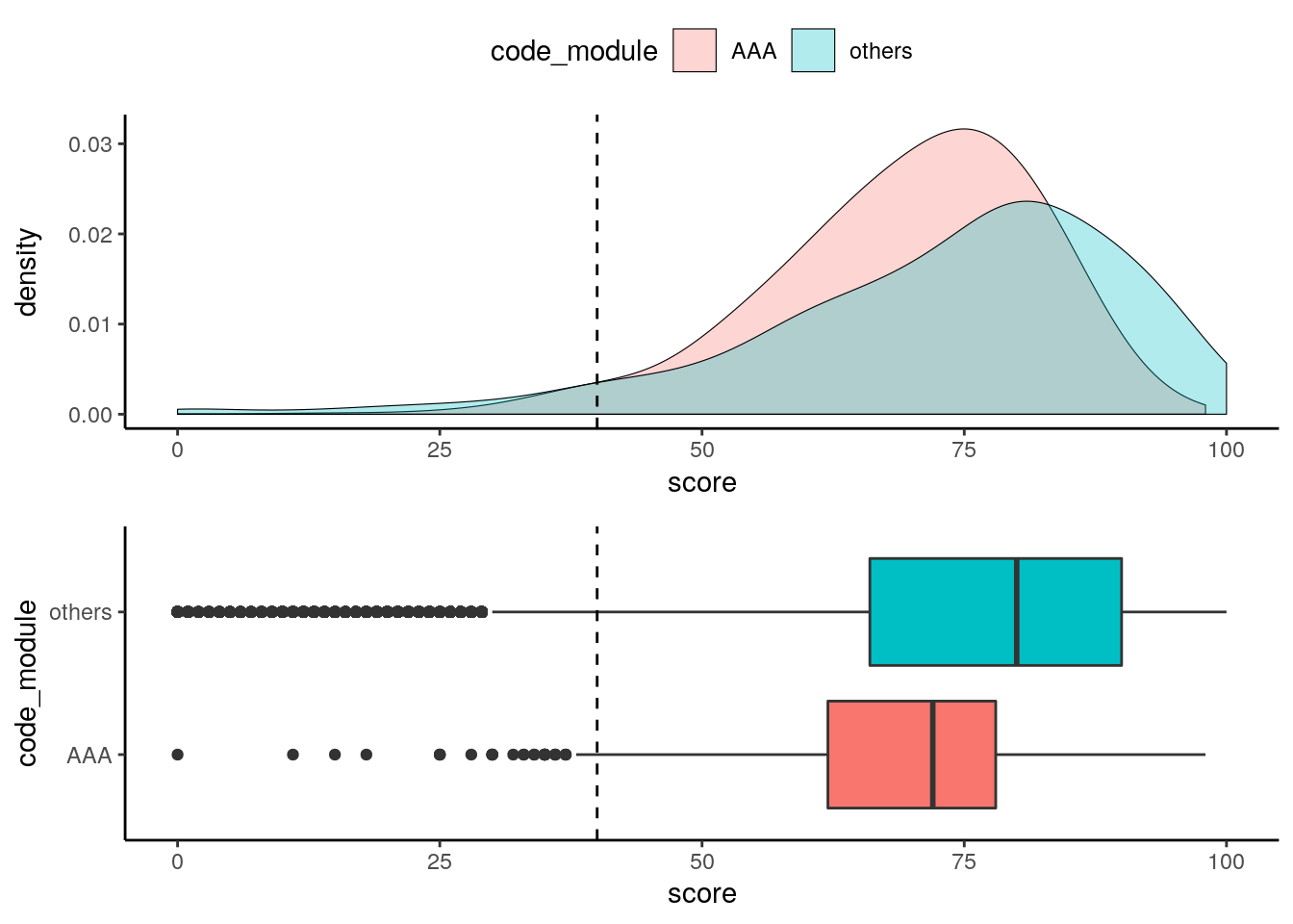 geom_boxplot(data = df_score, aes(x = code_module, y = score, fill = code_module)) +