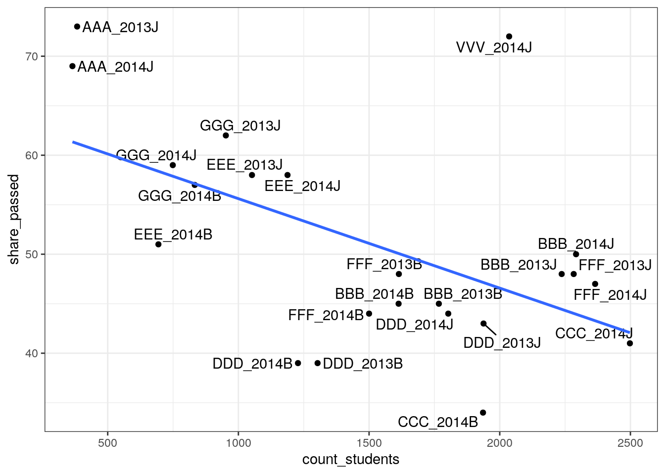 geom_smooth(data = df_courses, aes(x = count_students, y = share_passed), method = "lm", se = FALSE) +